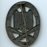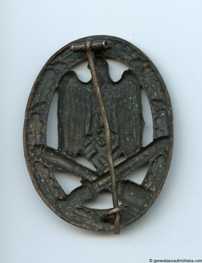 General assault badge by a still unknown maker. Early hollow Tombak construction with directly soldered catch. The badge has been stored in a very bad way and shows signs of pitting and oxidation. The badge was treated with some sort of brown and fatty substance. All though the condition of this early GAB it remains a clear example of the unknown maker 1, without damage or repairs. Cheaper alternative for the early GAB.