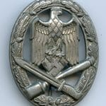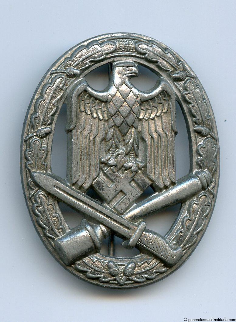 General assault badge in silver – Paul Meybauer, Berlin. Mid to late war semi hollow zinc variant with soldered on setup. Remains in nicely worn condition with some finish remaining on the front and perfect galvanized finish on the reverse. Very esthetic and well detailed design linked to Meybauer.
