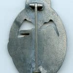 Panzer assault badge in silver – ‘Rocky’. Mid to late war PAB made from heavy solid zinc. Shows the so called rocky style cut out of the wings on the back. Remains in unworn condition and lost some of the finish due to being poorly stored. Normally this chrome like finish holds very well. Good looking Vienna design PAB.