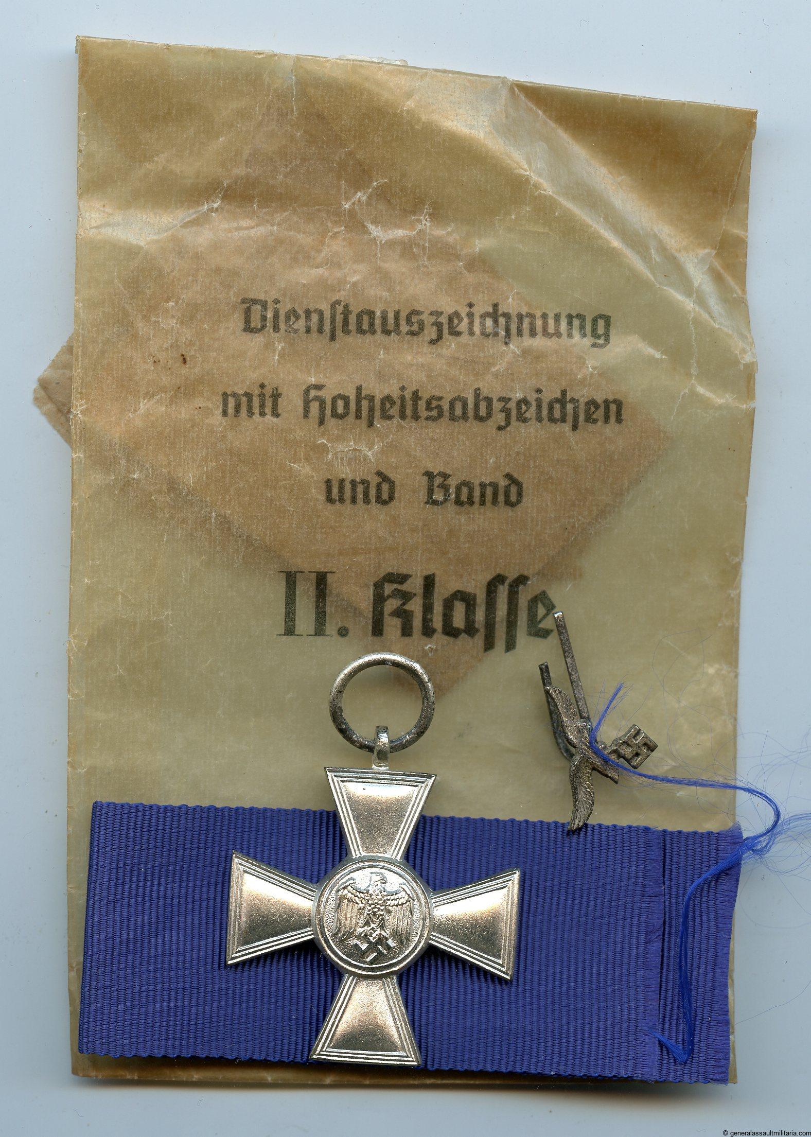 18 year loyal service medal + packet and Luftwaffe attachment. Iron medal with silver finish in near perfect condition. Comes with its original blue ribbon and tombac Luftwaffe eagle attachment for the ribbon. The very rare 2th class packet remains in good condition with some cracks and age, but nothing out of the ordinary for these fragile packets.