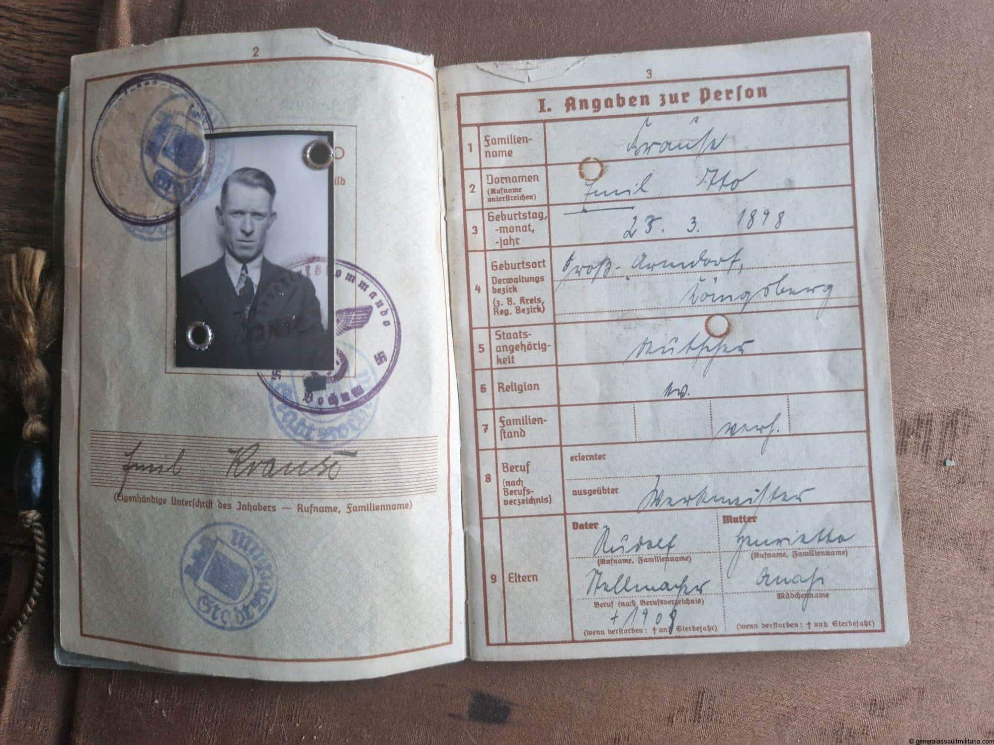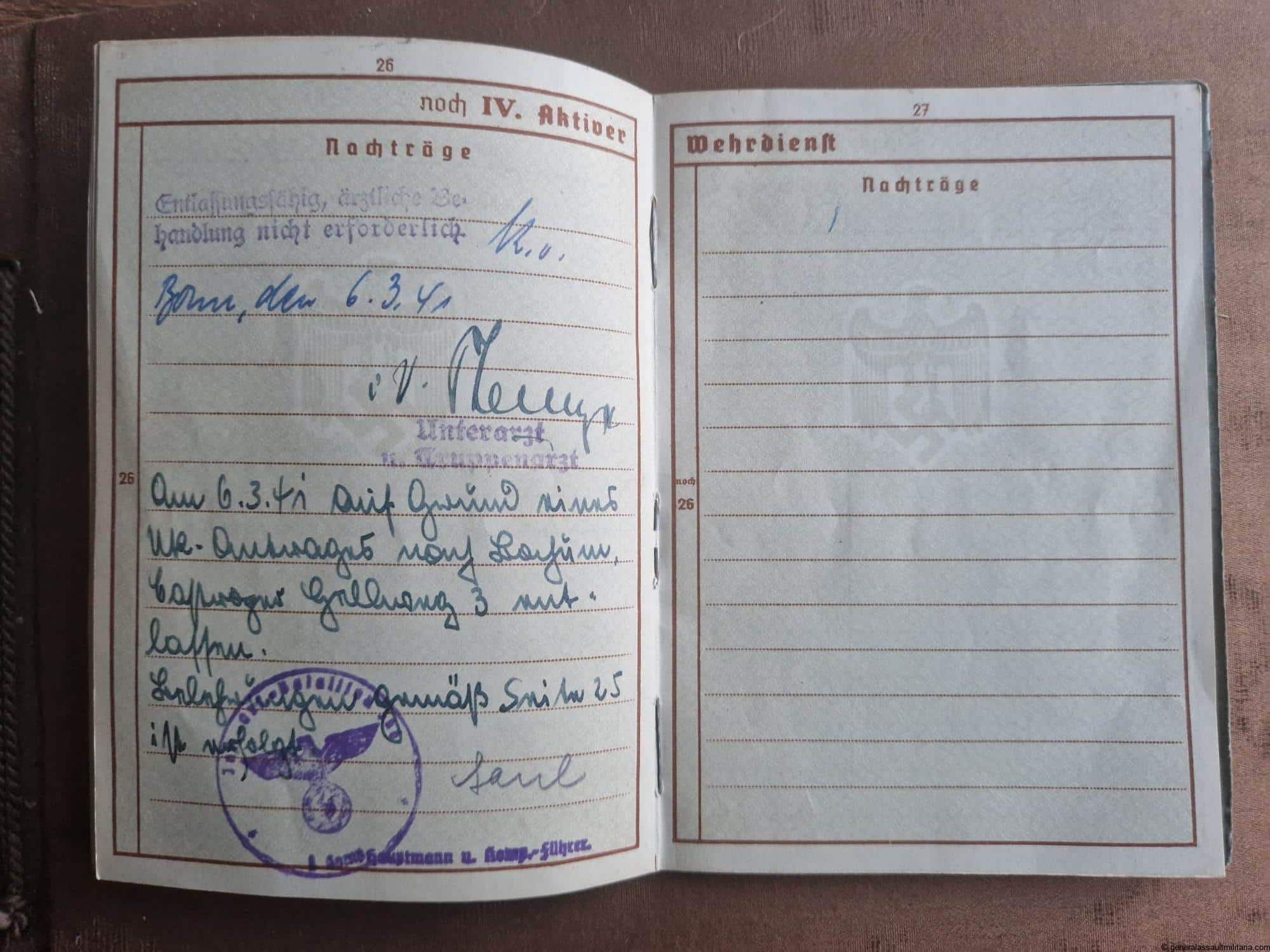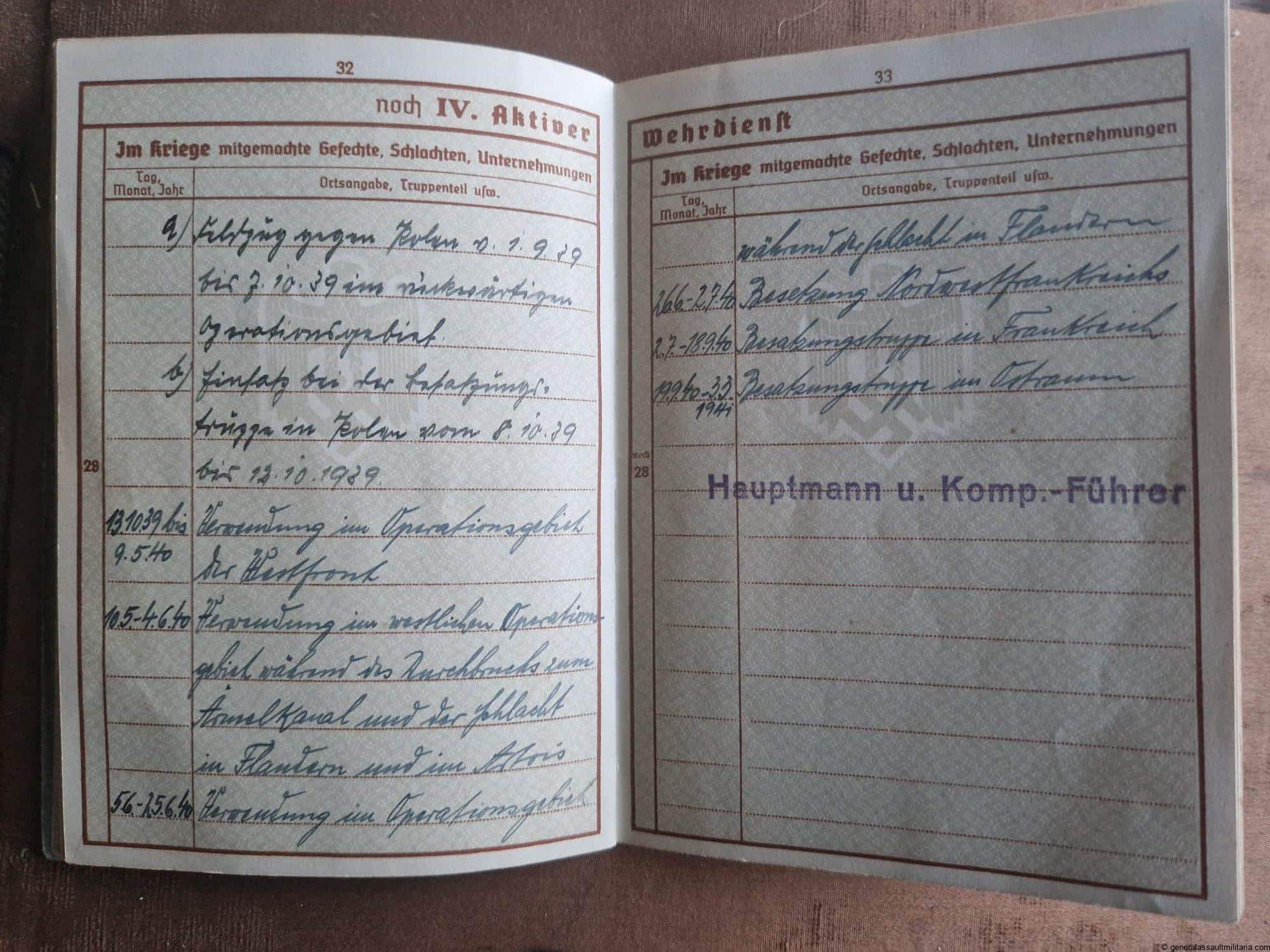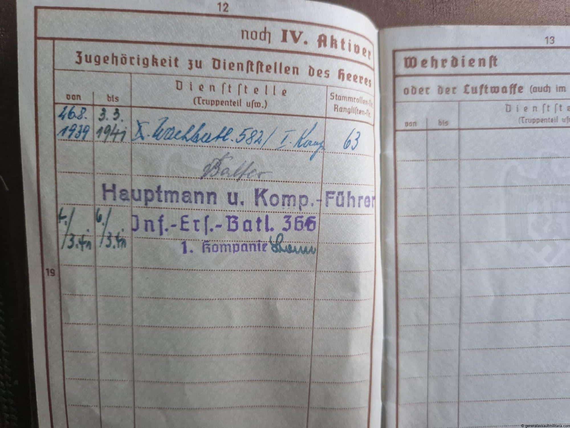 The Wehrpass as a couple entries of service for the Wachbatl. 582 and Inf. Ers.-Batl. 366.