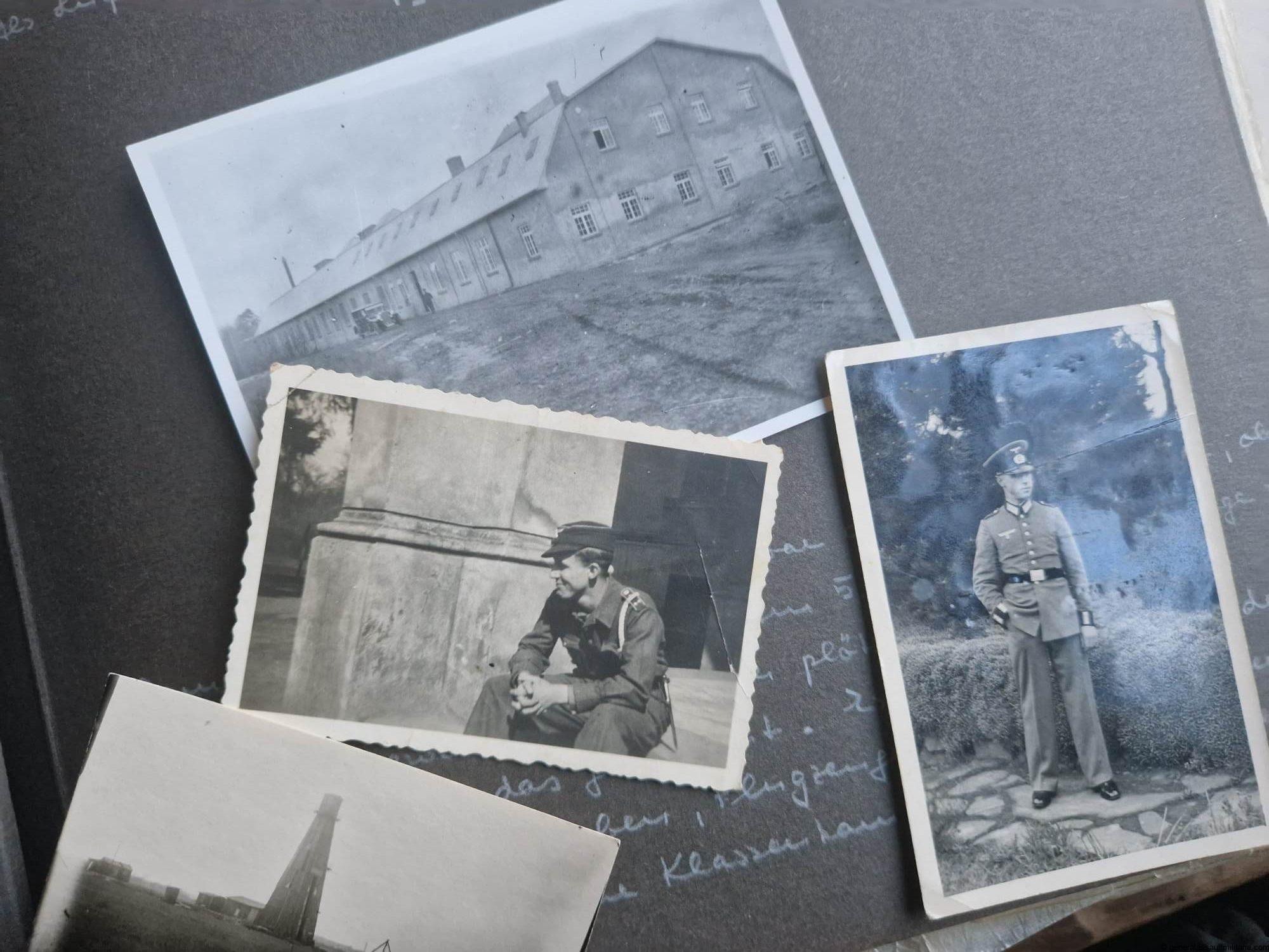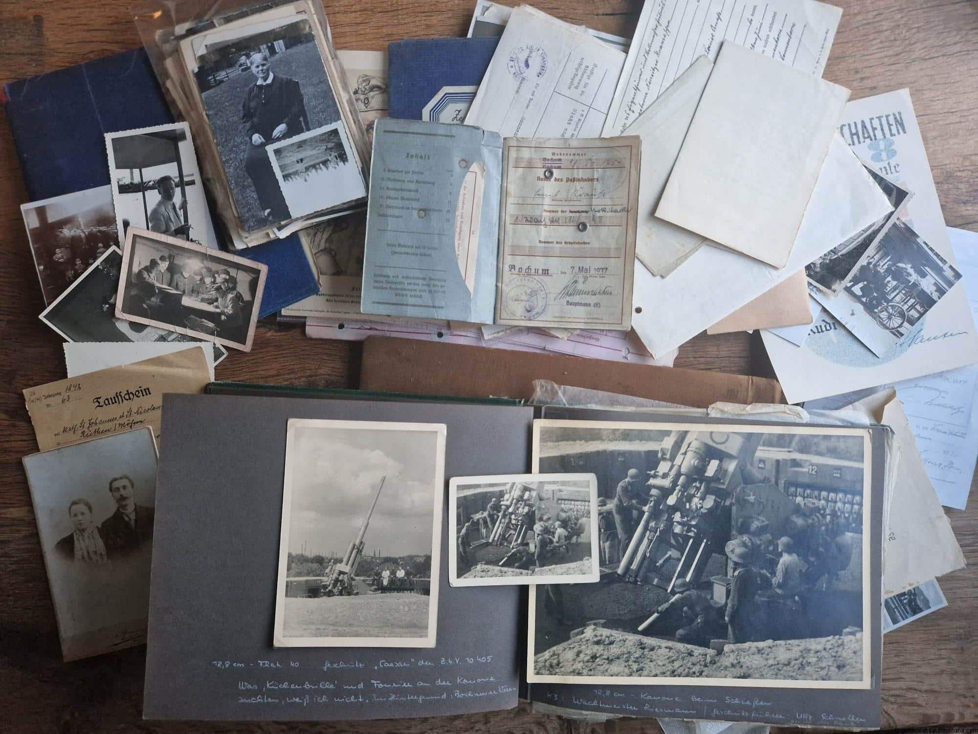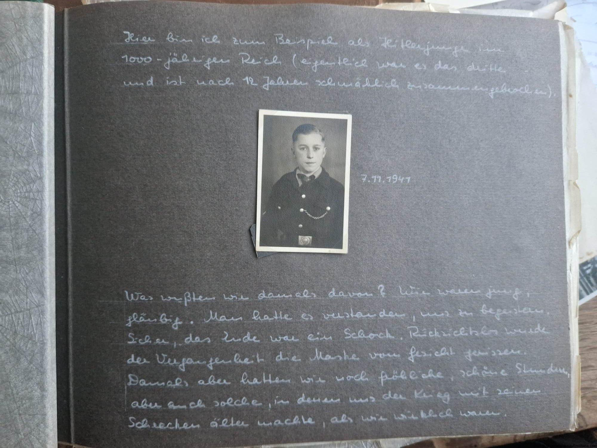 Large family photo album estate with 12.8cm Hitler youth Flak helper. Consists of two albums, lots of paper work, Wehrpass and some other bits and pieces. Most of the pictures shows pre war and war time family pictures, with a few soldier and HJ related photos. Most interesting are the 12.8cm flak pictures and the additional text written below the army related photos. The text was added later by the owner as can be concluded from his way of writing(looking back at the past).