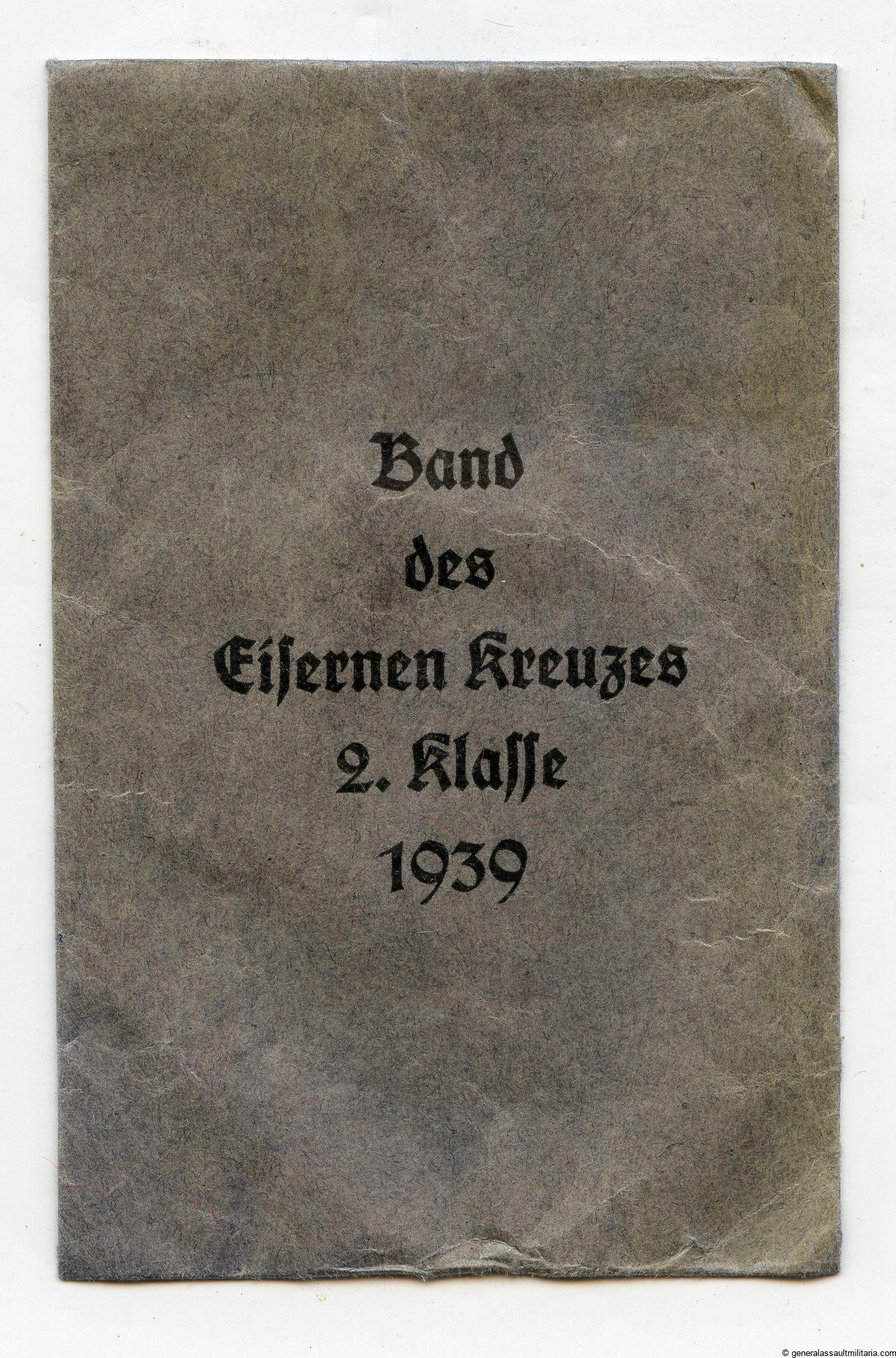 Ribbon for the Ek2 packet – Carl Knoblauch, Berlin. Very uncommon packet ‘Band des Eisernes kreuzes 2. Klasse 1939’ intended to hold the ribbon for the Ek2s. Remains in very good condition with only light fading of the the deep blue color and little to no wear. Maker marked on the large flap.