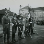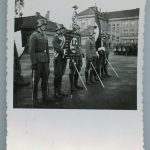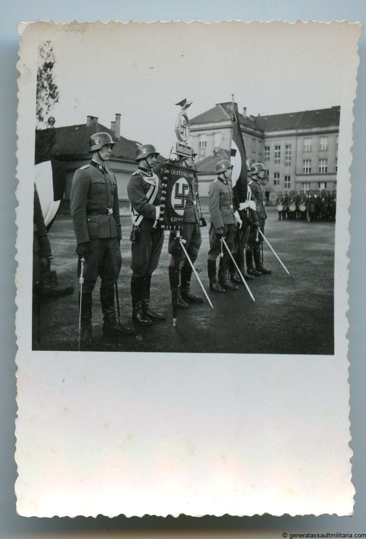 SS photo with the Deutschland standarte flag. 6x9cm photo of ss soldiers with SS swords and the Deutschland Erwache, Deutschland flag pole. The photo remains in good condition, at some point someone wrote Prag on the back. If the photo was taken in Prague is unknown to me.