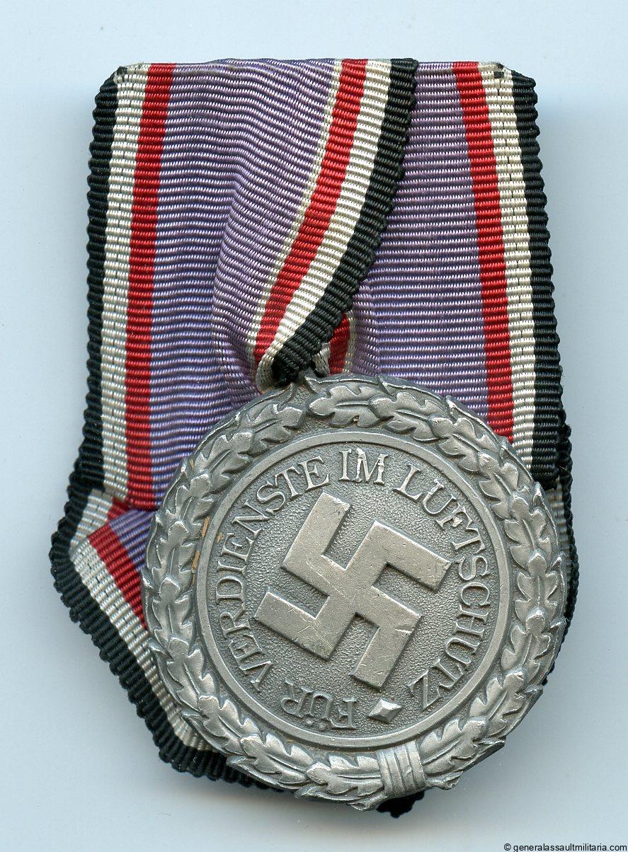 Luftschutz medal 2nd class single mounted. Aluminum Luftschutz medal single mounted medal bar without backing. Remains in excellent nearly unworn condition and shows a still bright ribbon in lightly worn condition. Extremely uncommon as a single mounted version.