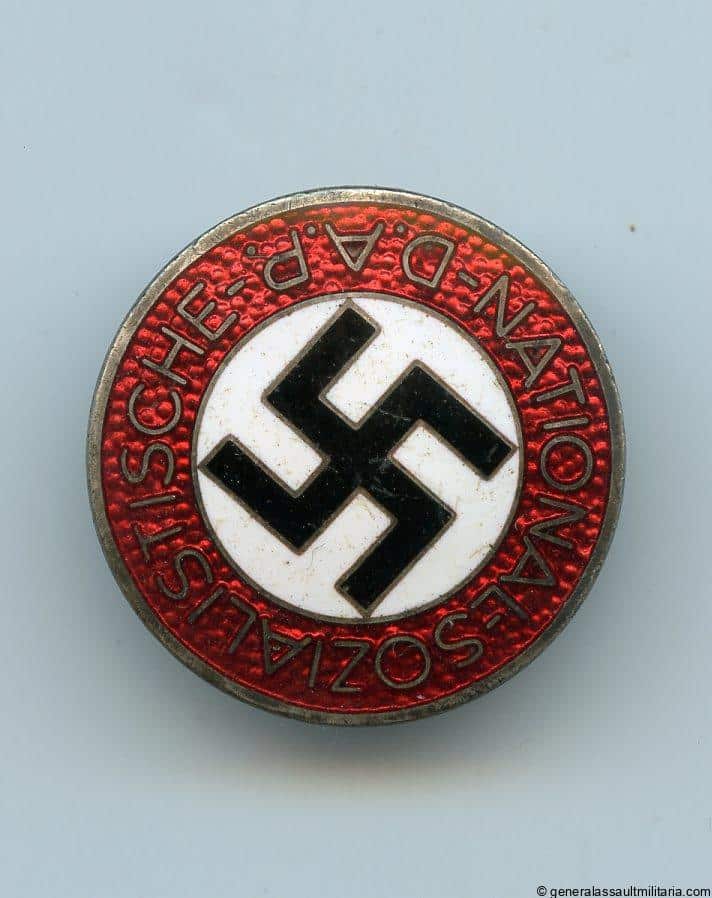 NSDAP party badge – RZM M1/63 Steinhauer & Lück, Lüdenscheid. Tombac badge with enamel inlay and silver finish. Remains in well used condition with some scratches on the front and proper wear on the back. Shows the RZM M1/63 mark for S&L on the back and has the setup still nicely attached and functional. Bit more uncommon RZM S&L.