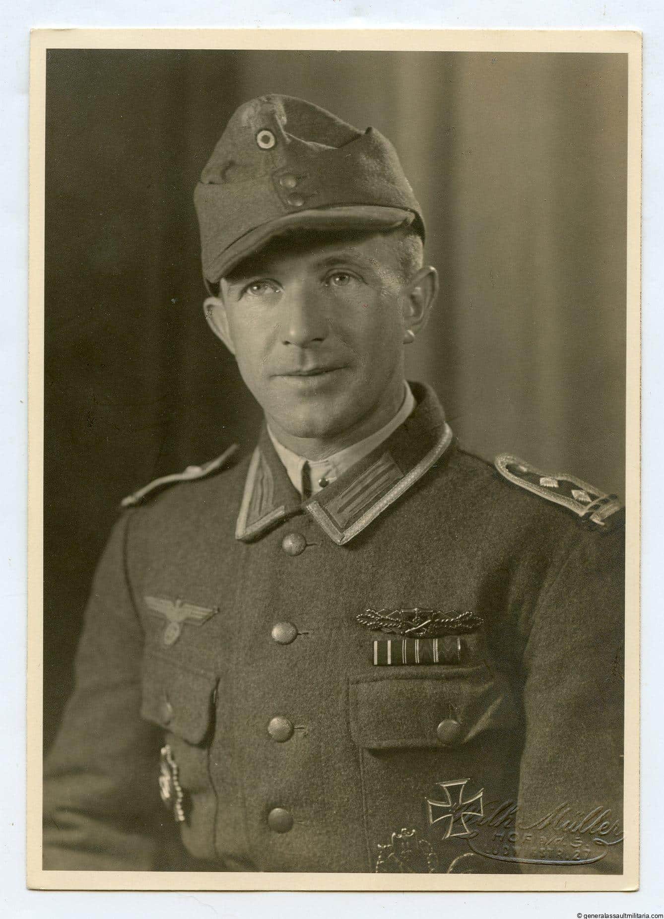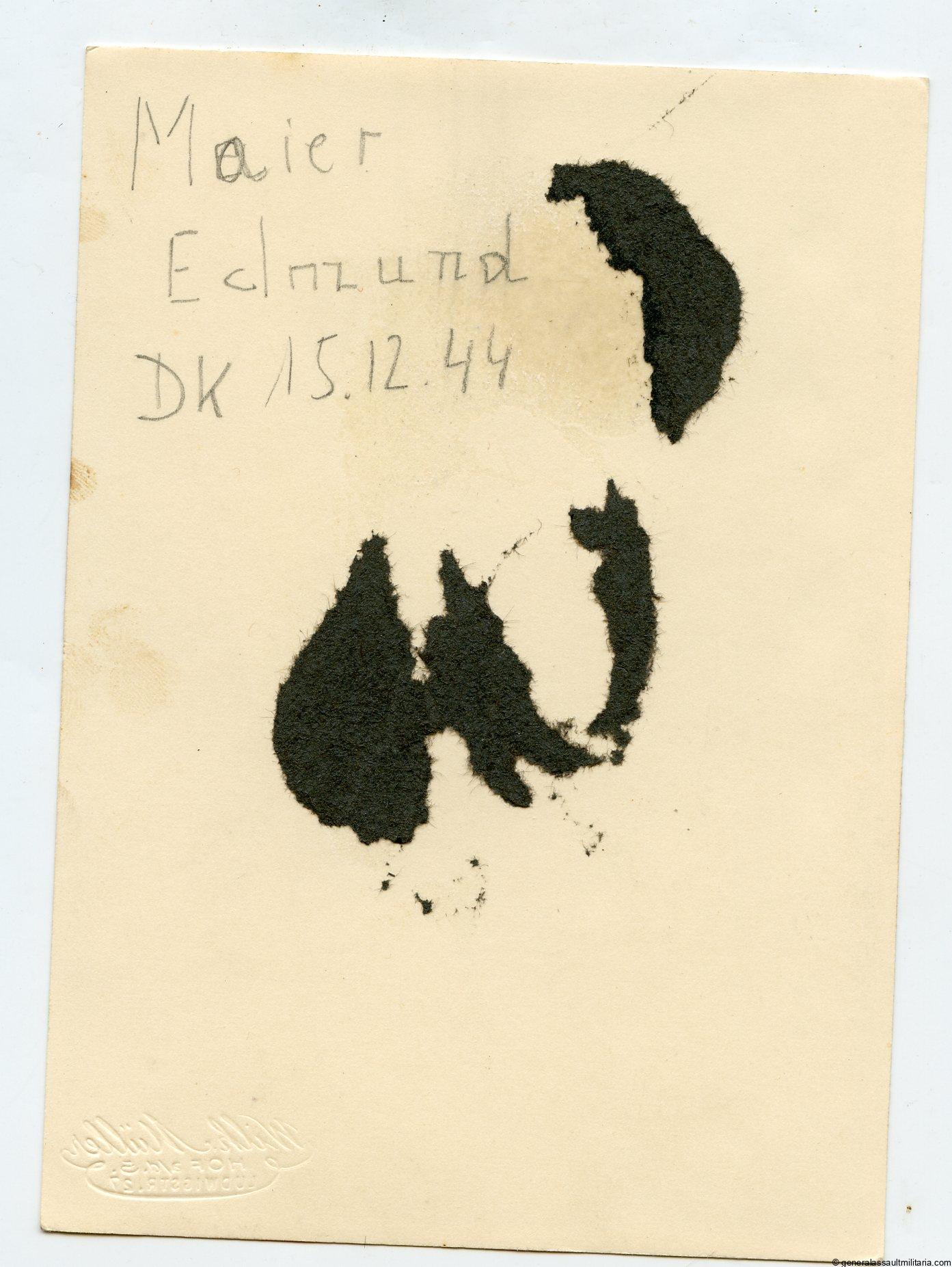 German cross in gold portrait – Edmund Maier 15.12.44. Slightly larger than post card size portrait with to infantry Oberfeldwebel Edmund Maier. CCC, WB, Ek1, IAB and Dk in wear with modified field cap. Very sharp and good looking portrait. Nicely atelier stamped at the bottom and album removed at some point in time.
