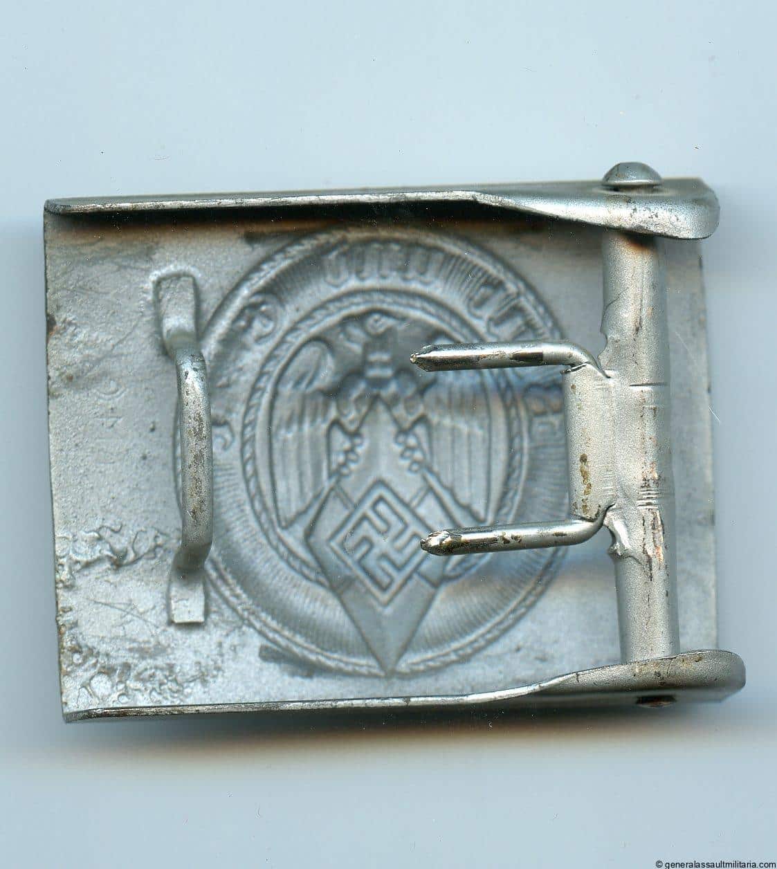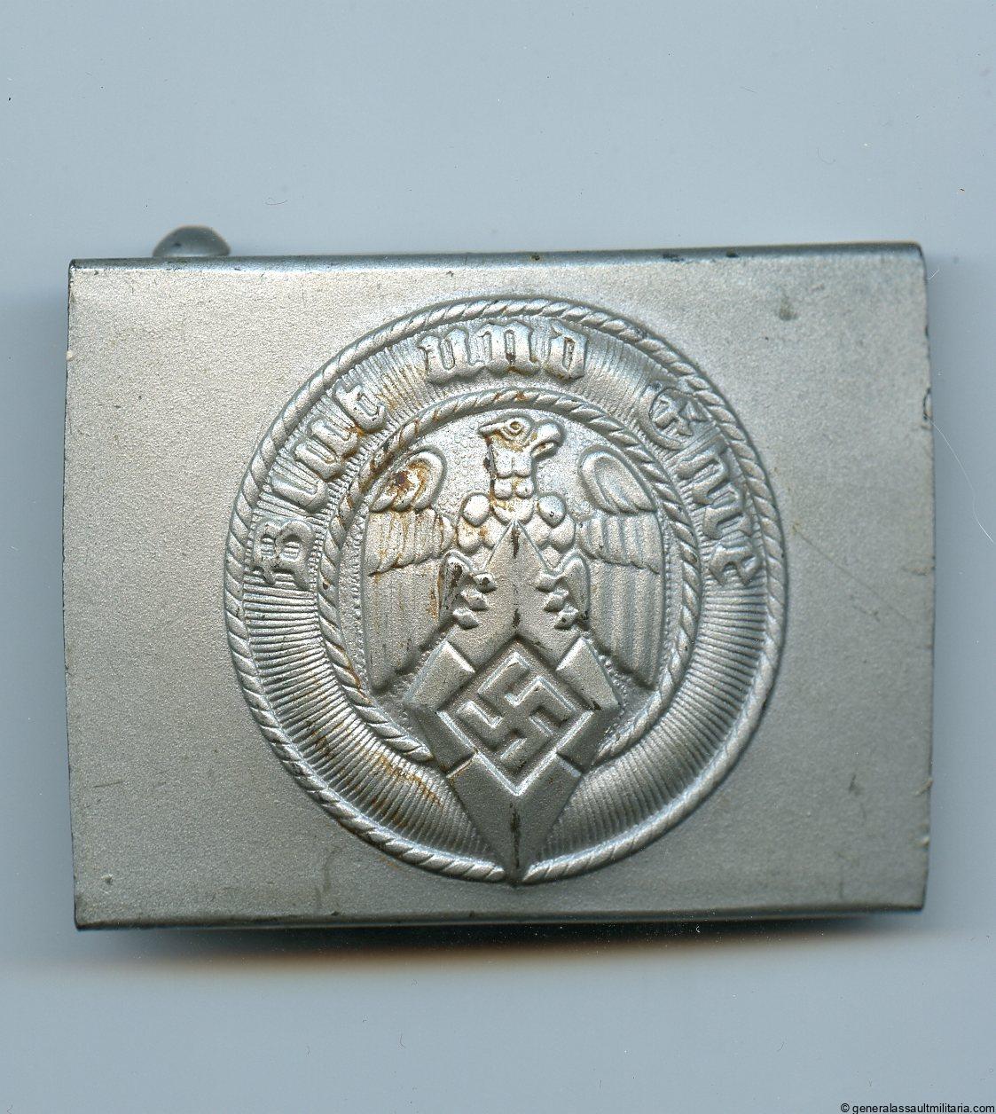 Hitler youth buckle – RZM M4/42 Hermann Aurich, Dresden. Late war steel Hitler youth buckle with thick silver finish. Remains in unworn near perfect condition with nearly all paint remaining. Very well preserved example.