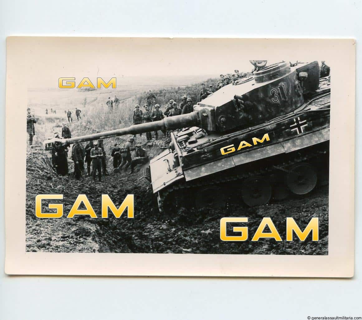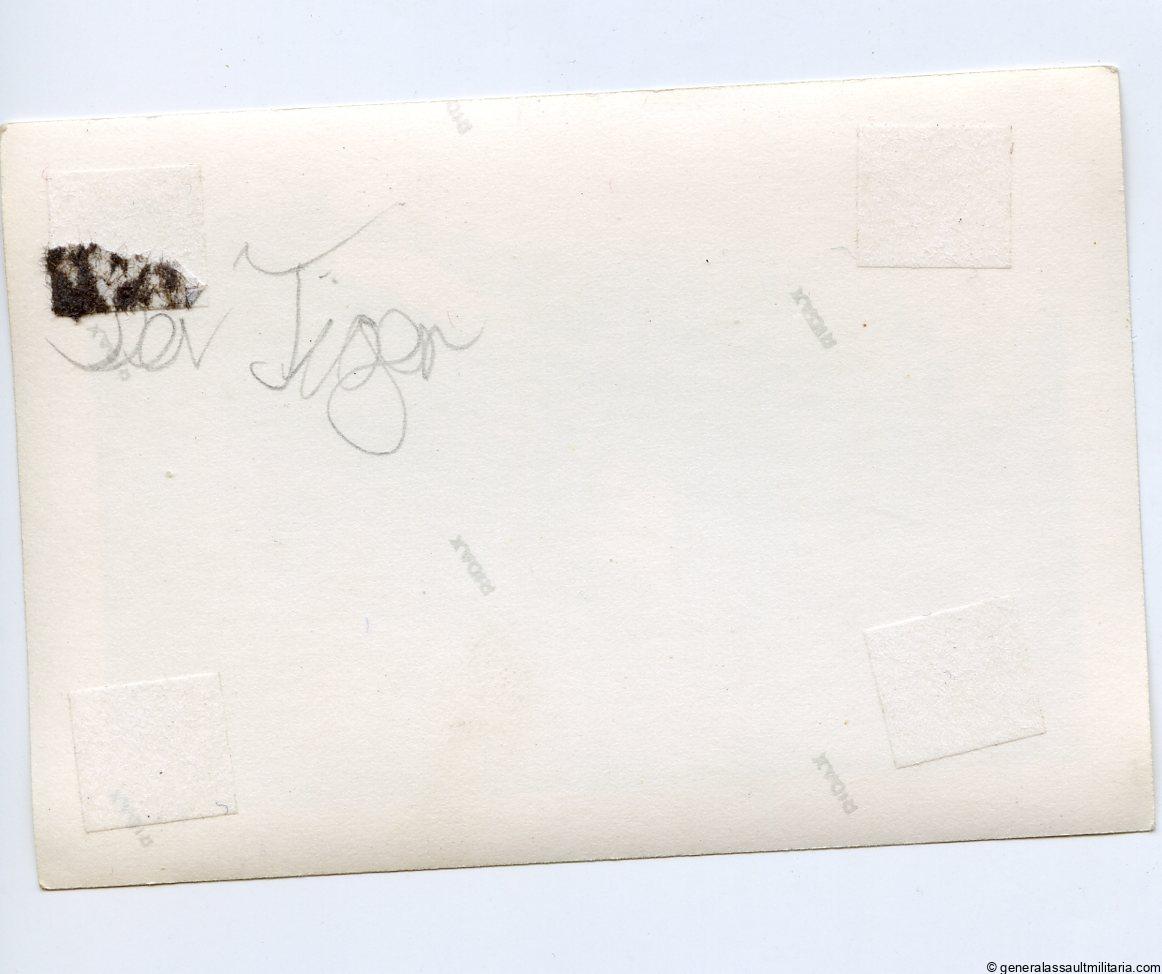 6x9cm Tiger Panzerkampfwagen VI photo taken from the side. Shows the Heavy Tiger I with number 311 getting read to position itself in a tank ditch with soldiers admiring around it. Remains in excellent condition and has a good sharp look to it. Produced on ridax photo paper. Top Tiger shot. Album removed.
