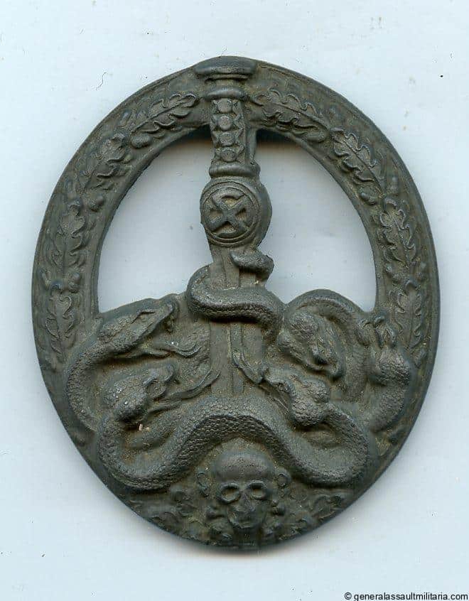 Anti partisan badge in bronze – C.E Juncker, Berlin. Mid to late war zinc APB with no holes, no cut next to the sword and the first snake. Remains in very good condition and does not show any signs of wear, has no cracks in the wreath and shows sharp detailing with minimal flaws. The bronze finish has faded for the most part only showing on the top rim and next to the hinge or on the setup. Very sought after award that has become very difficult to obtain. This type 2.3 being a very clean and sharp detailed example. Excellent ‘Bandenkampfabzeichen’.