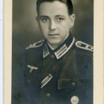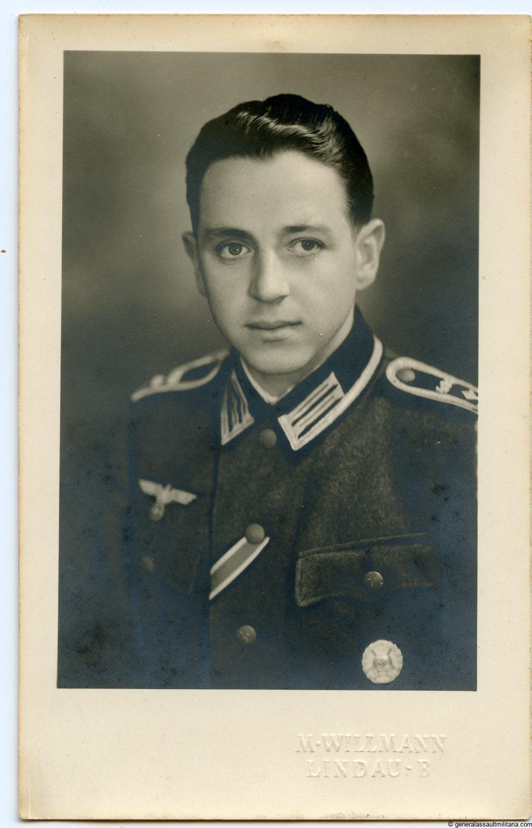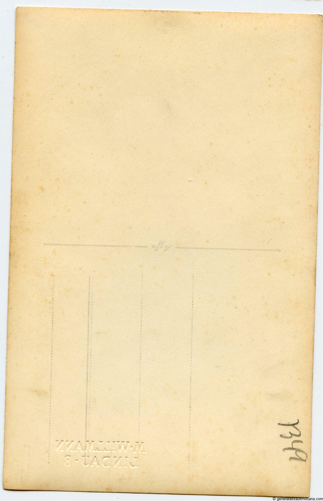 Heer soldier wearing the first pattern wound badge in silver and EK2 ribbon. Postcard size but the picture it self is slightly smaller. Produced on Mimosa paper and remains in good condition, only little staining near the darker parts giving the portrait a bit of glare. The soldier is wearing numbered boards but its hard to read, the first number is 4..