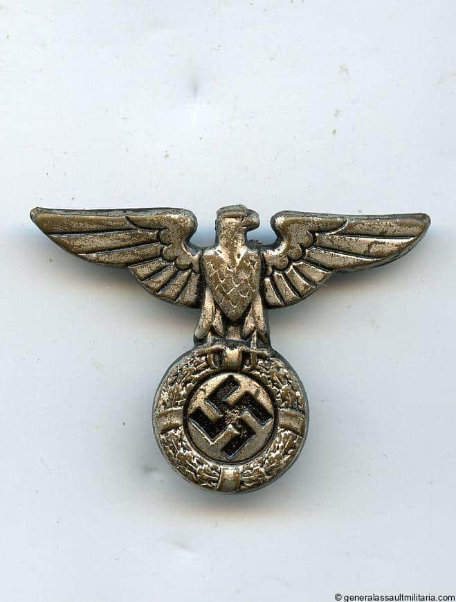 Early political cap eagle. Tombac construction with silver plated finish and black painted swastika. Remains in lightly worn condition with some of the base material exposed and patinated reverse. Both prongs are intact.
