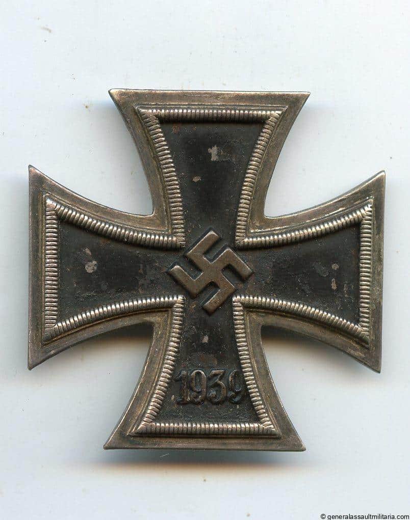 Iron cross 1st class – L/15 Otto Schickle, Pforzheim. Early war maker marked L/15 on the pin cross with Schickle frame and core. Remains in well worn condition with some of the paint worn down on the core, a few rust spots and a good patina on the frame. The reverse shows most of the original bright finish still unpatinated. Very uncommon L/15 marked cross.