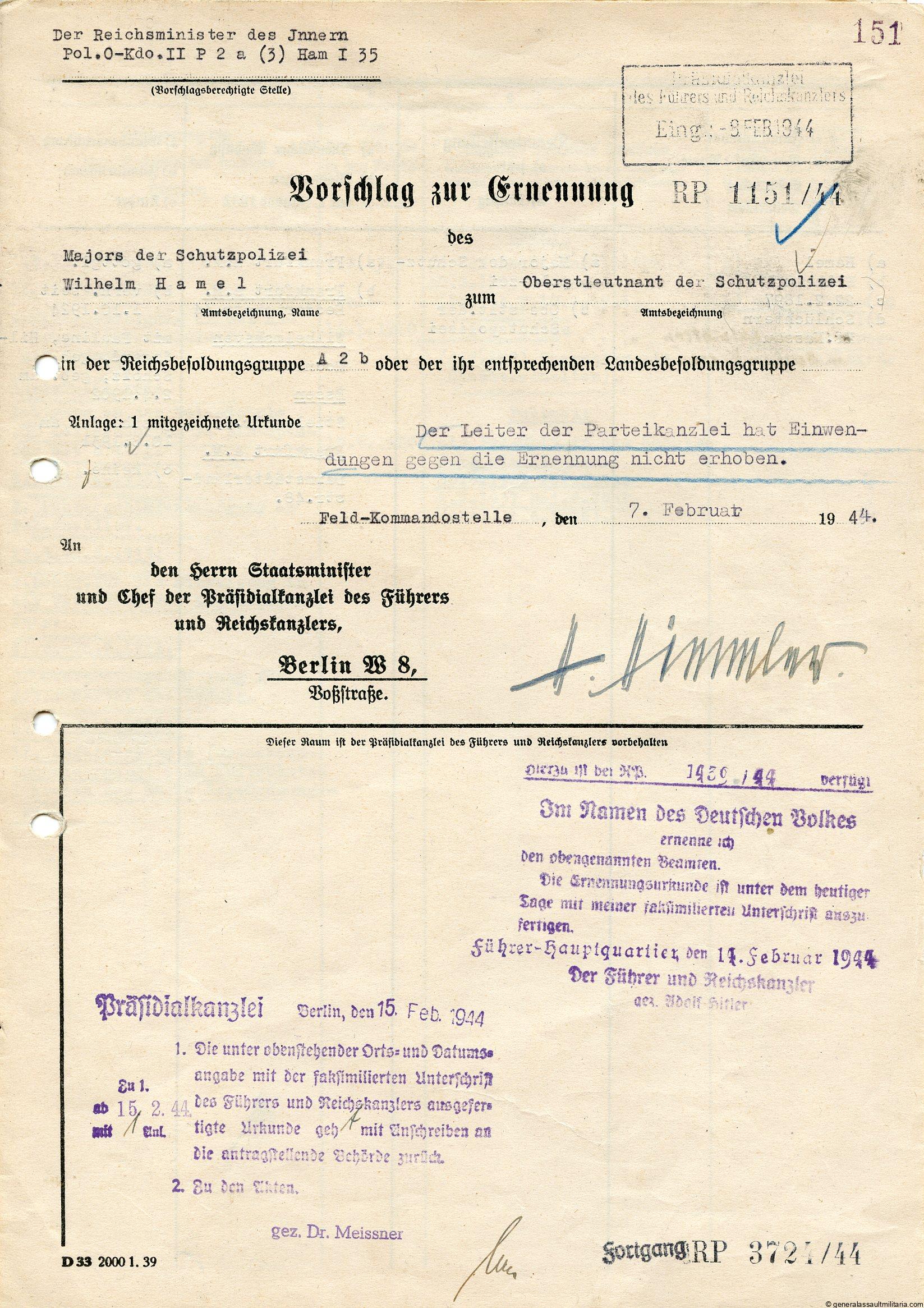 Promotion document with Himmler signature. 4 page promotion document to Wilhelm Hamel, Oberstleutnant der Schutzpolizei. Vorschlag zur Ernennung of the Reichs chancellery Berlin 7.2.44. Document was singed by Heinrich Himmler late in the war with his full hand written signature. Wilhelm Hamel was bron in on 22.2.1897 in Schlüchtern, and was promoted to Oberstleutnant late in the war. He was a ww1 veteran and a NSDAP member since 1.5.33. The document is archive file and shows all his private information on the other pages.