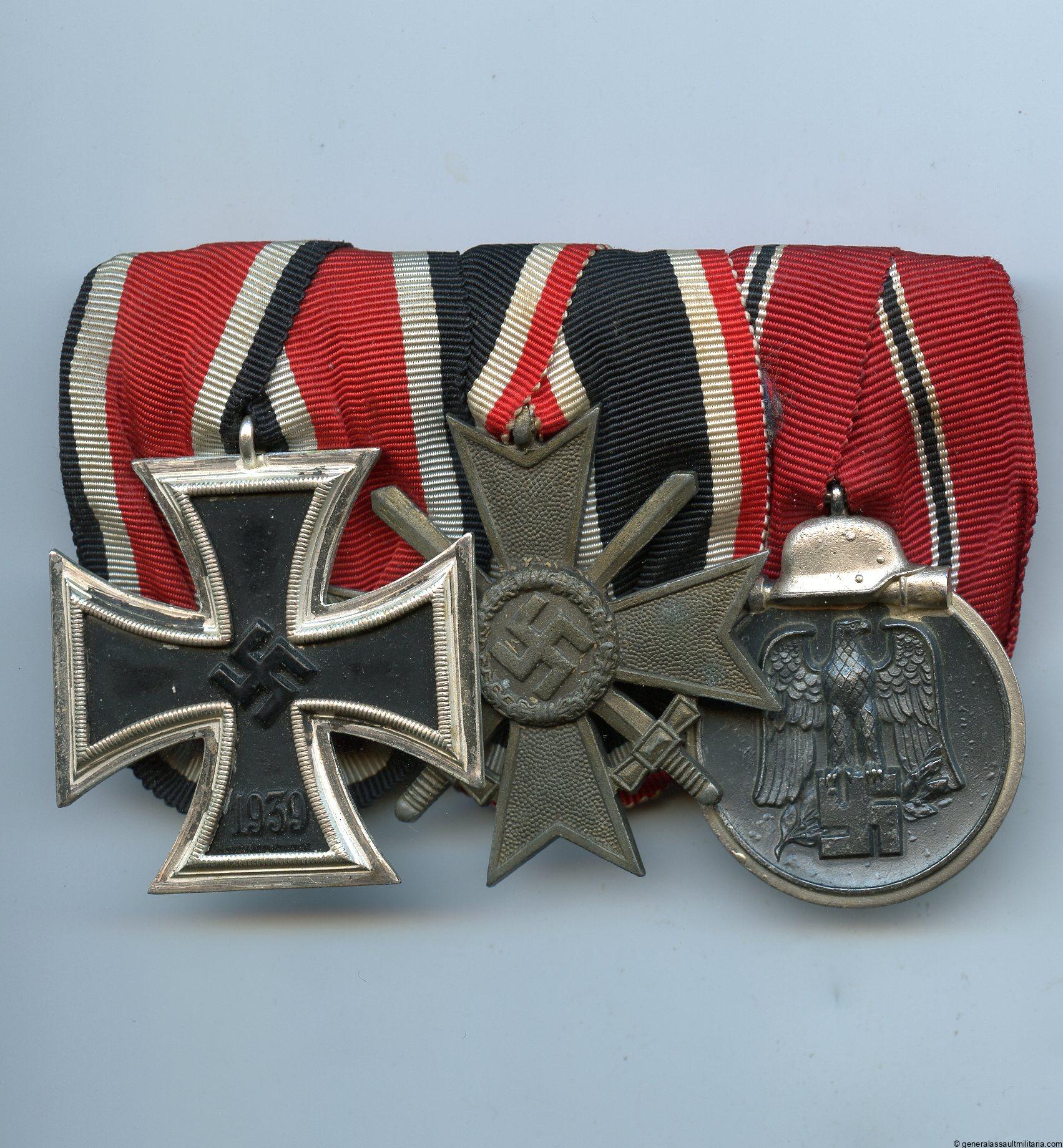 3 piece medal bar with KVK2, Ek2, Ost. Early to mid war three piece medal bar with Brehmer Ek2, zinc war merit cross 2nd class and Ost medal. Ek2 retains all the frosting and shows some patina on the back and front, with minor wear to the finish on the core. Zinc ost medal retains the finish almost perfectly and has a beautiful look to it, the zinc kvk2 has slightly darkened. Not so easily found combination of awards nicely mounted with red backing.