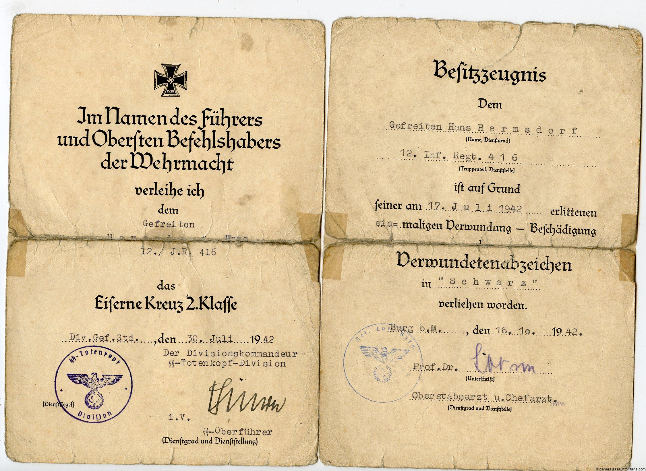Two award documents I.R. 416 with SS-TK Max Simon signature. Two fairly salty documents to a member of infantry regiment 416 who was attached to the 3th SS Totenkopf Division for a while in 1942. The Ek2 document was singed by Oak leaves winner SS-Oberführer Max Simon. Very rare signature of one the highest decorated SS members.