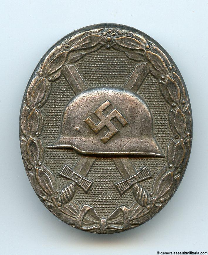 Wound badge in silver – Deschler & Sohn, München. Early war tombac wound badge with ‘Übergrosse’ Deschler/Wiedmann design. Remains in lightly worn condition with some of the silver plating worn done and the catch slightly bend upwards to keep the pin nicely in place. Only shows minimal patina. Very high quality and sought after oversized WBS.