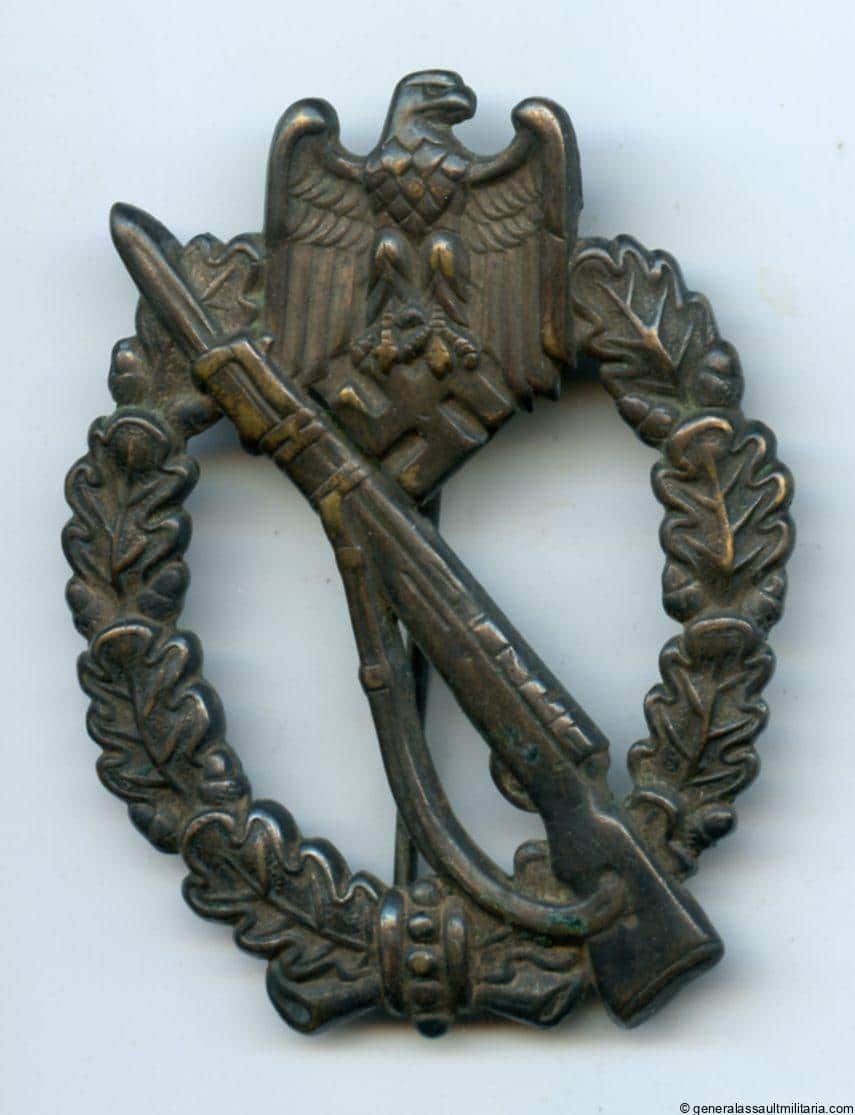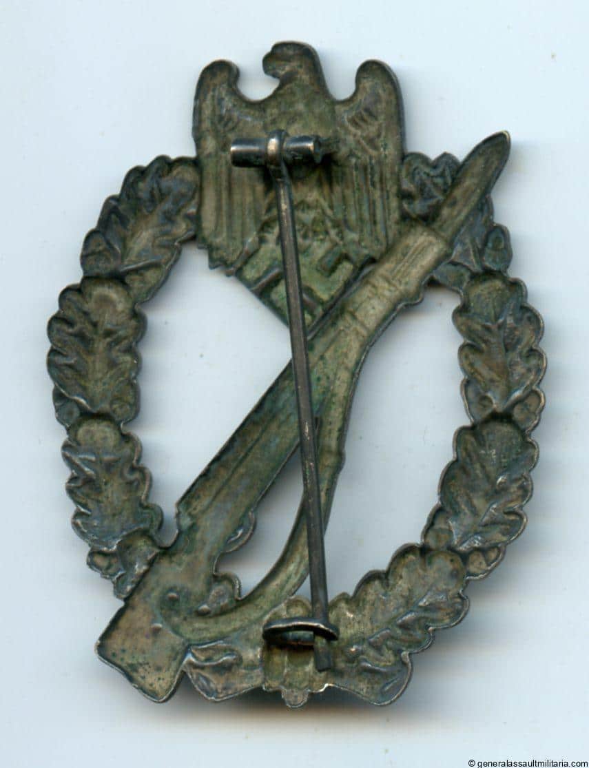 Infantry assault badge in silver – Otto Schickle, Pforzheim. Early war hollow tombac Schickle design IAB with silver plated finish. Remains in lightly worn condition with some of the base material exposed and the silver plating worn down on these area`s. Fully patinated look making it appear nearly black. Untouched and uncleaned example with nicely distributed patina.