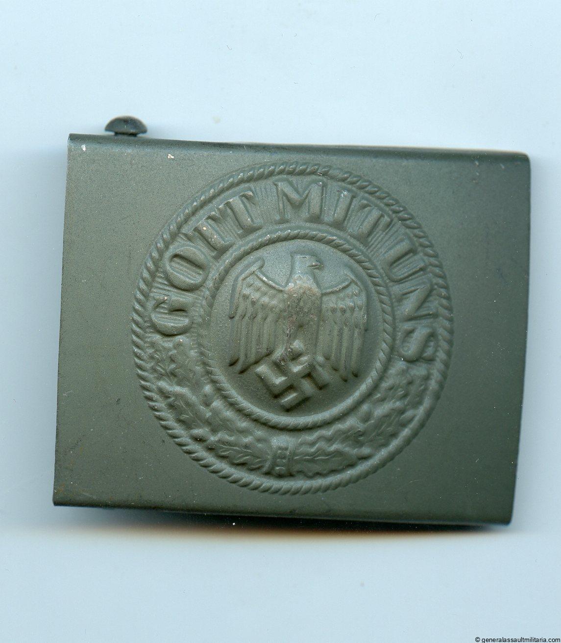 Heer buckle – RZM M4/44 Paul Cramer & Co., Lüdenscheid. Steel construction buckle with RZM M4/44 mark for Paul Cramer who mainly made political buckles and stamped their Wehrmacht buckles with the RZM mark. Very uncommon example in near mint unworn condition, has nearly all the green finish still present.