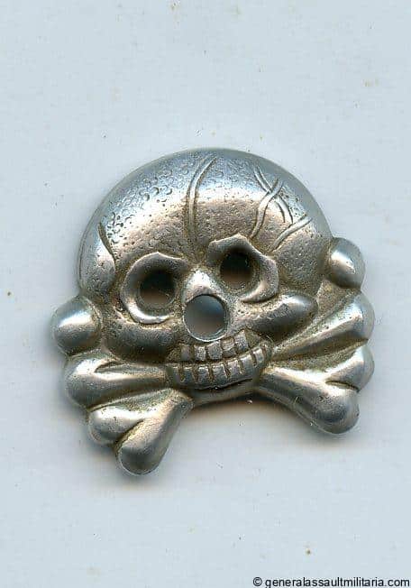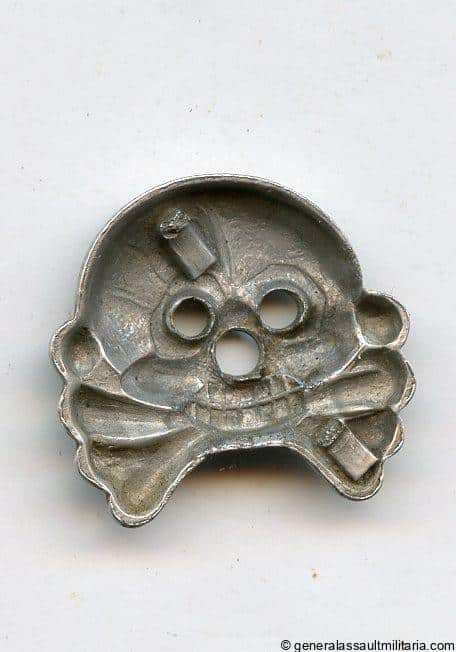 Panzer collar tab skull – Aluminum type. Early war aluminum construction skull with both prongs broken. Worn condition with nice details and a widened nose.