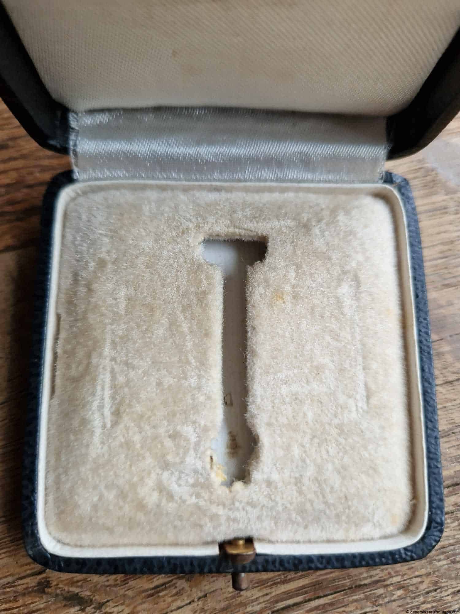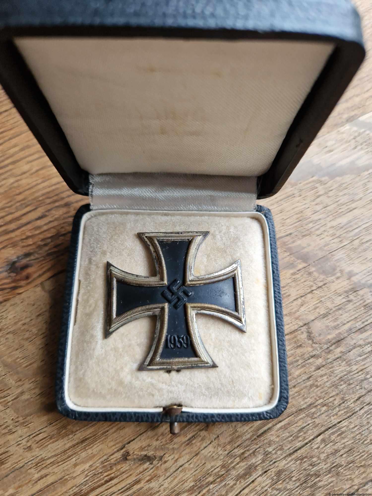 Iron cross first class Schinkel cased – Wilhelm Deumer, Lüdenscheid. Early war Schinkel frame design cross by Wilhelm Deumer with magnetic core. Remains in very good light worn condition with some wear to the core and frosting on the frame. Very good looking slightly curved example with long round wire catch and early Deumer hinge setup. Very sought after example of the 1939 version with Schinkel design frame. Comes with matching Deumer style case in very good condition, minimal wear to the outside.