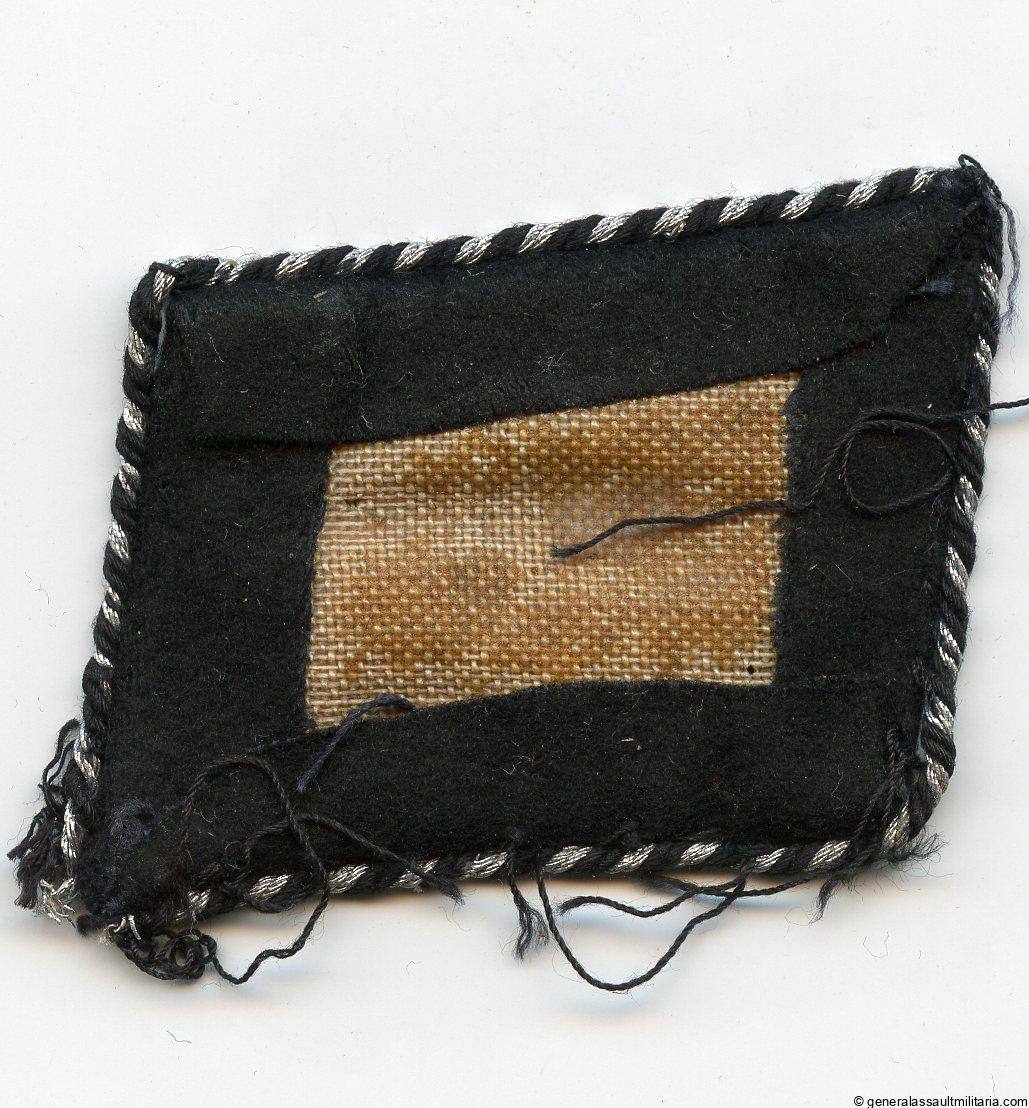 Waffen-SS RZM Woven tab. Smooth wool base with woven SS runes, buckram backing and signs of where the RZM tag used to be. Remains in uniform removed condition and has hand applied black and silver twisted piping around it. Overall very nice condition with some of the stitching still on the tabs. Interesting variation with the piping normally seen with SS-VT EM/NCO members.