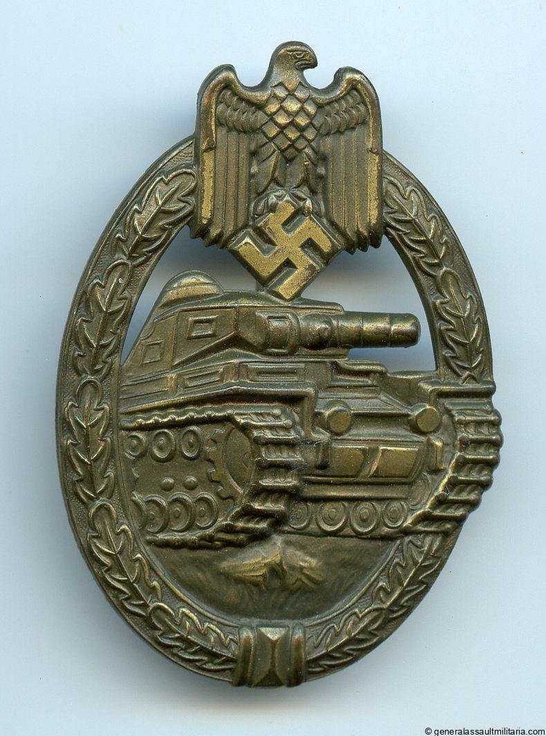 Panzer assault badge in bronze – Otto Schickle, Pforzheim. Early hollow tombac Schickle design PAB with machine milled C catch. Remains in lightly worn to unworn condition with near perfect bronze finish remaining. Very nicely preserved Schickle with a deep bronze color. Top badge!