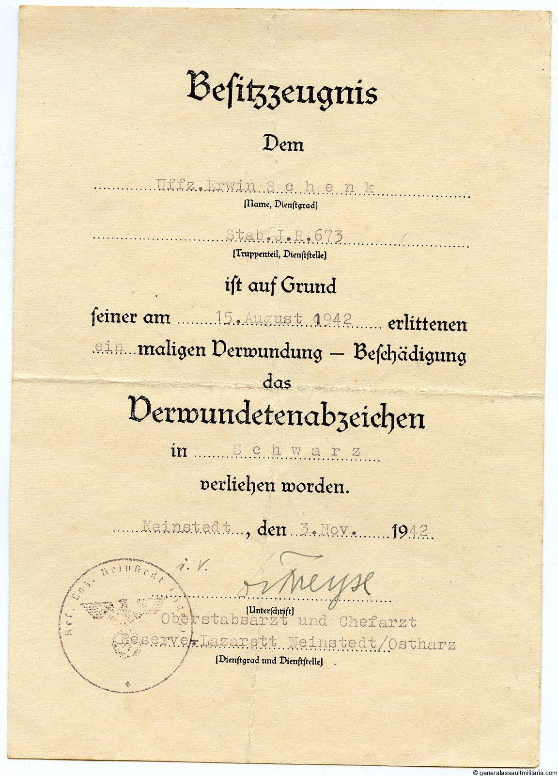 Wound badge in black award document I.R. 673. Award document for one time wounded Uffz. Erwin Schenk Stab Infanterie Regiment 673 on 15.08.1942. Infanterie regiment 673 was destroyed at Stalingrad early 1943 as part of the 376th Infanterie Division.