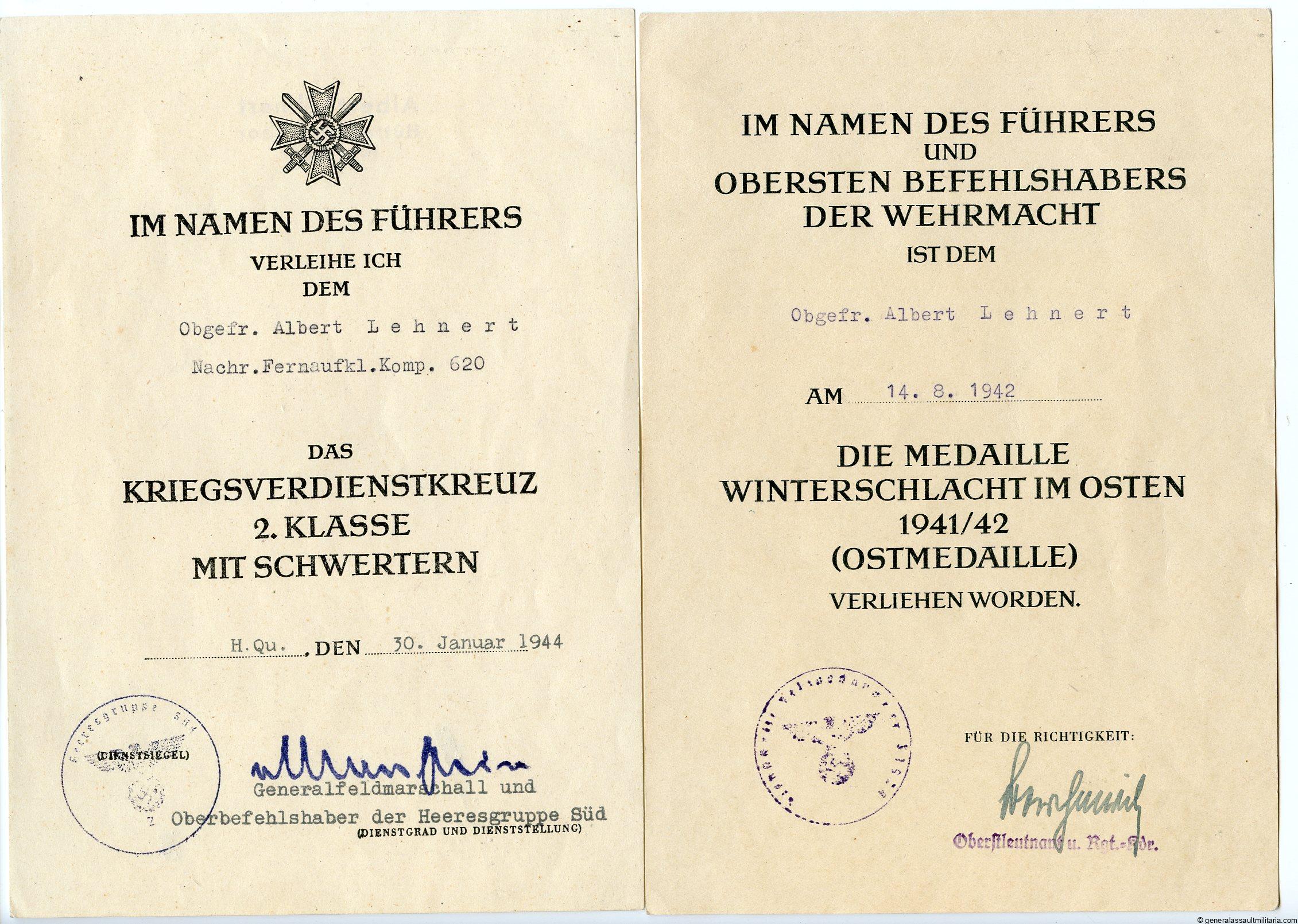 KVK2 + Ost medal certificate Nachr. Fernaufklärung Kompanie 620. Two award documents to Albert Lehnert from Saarland, war merit cross second class with facsimile Mannstein signature. Both remain in excellent condition.
