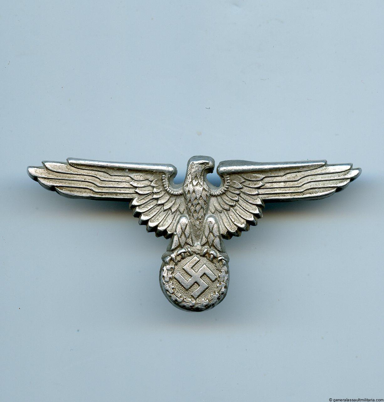 SS visor cap eagle – RZM M155/38. Early pre war 1938 aluminum construction with RZM M155/38 mark on the wing. Remains in worn condition with a slight patina. Killer example with lots of character, rare variant!