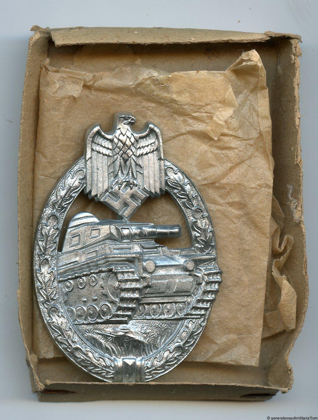 Panzer assault badge in silver – Hermann Aurich, Dresden. Late war solid zinc ‘Panzerkampfabzeichen’ with Aurich makers mark and crimped in setup. Glanzverzinkt finish remains in excellent near mint condition, with no wear. Comes from the Aurich hoard and has the original packing paper and top half of the box still present. Beautiful example.