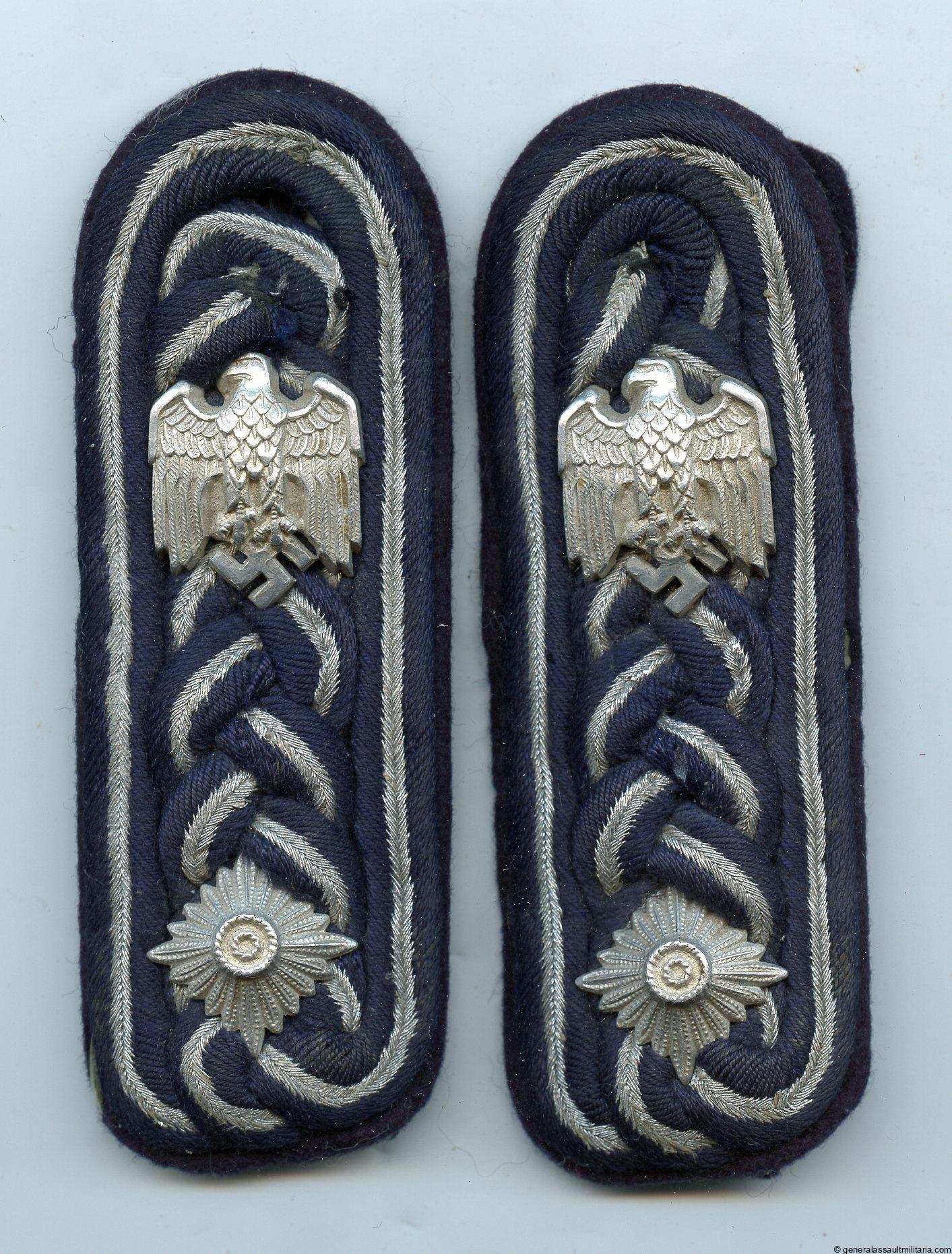 Kriegsmarine administration official shoulder boards. Blue shoulder boards with aluminum eagle attachment. Remain in used condition with normal wear and two uncommon eagle attachments still present. Very uncommon boards with one of the best looking attachments.