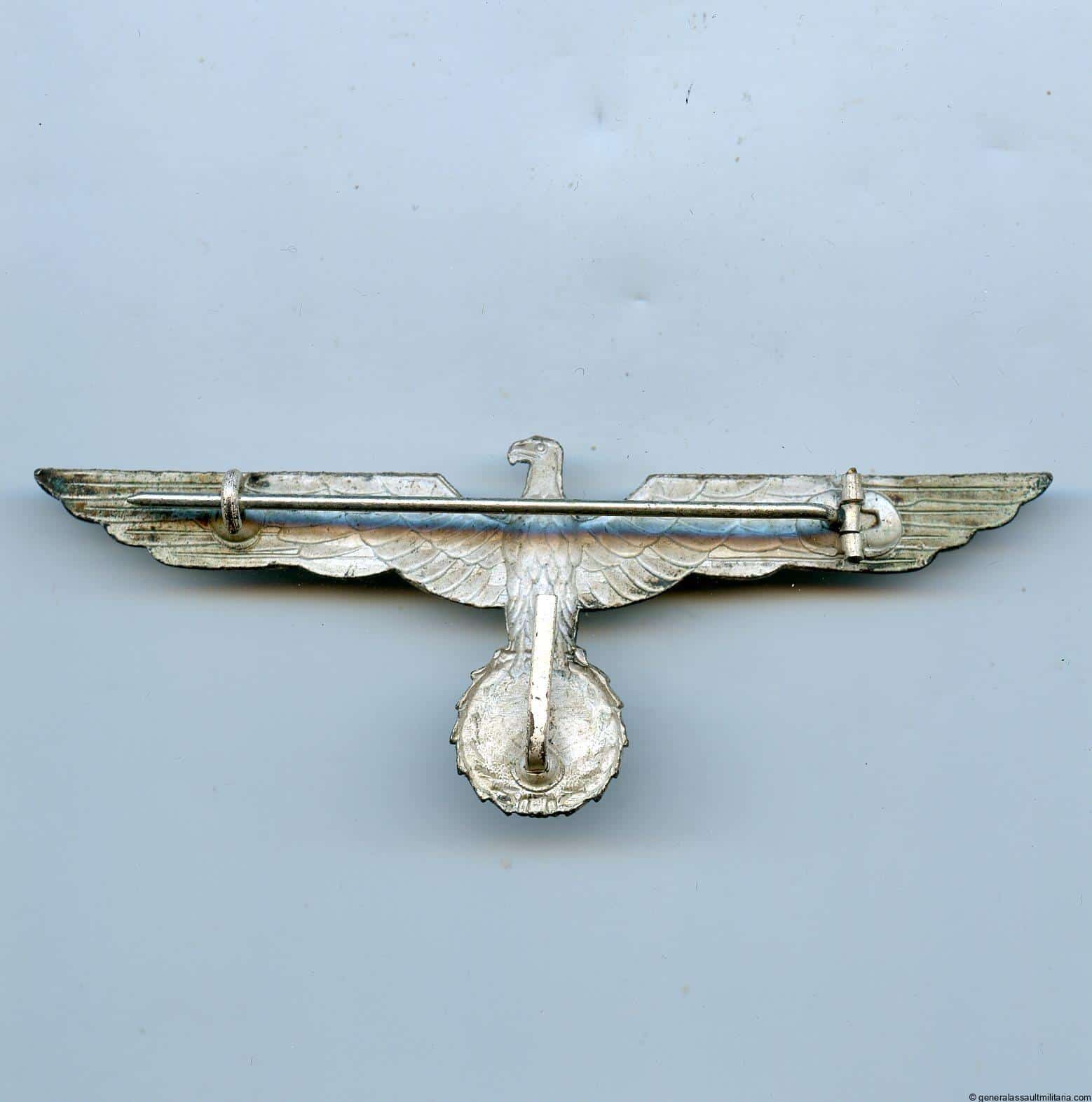 Heer Summer uniform eagle. Early tombac eagle with silver finish and polished highlights. Remains in unworn condition with crimped in catch and shows a slight patina at some areas. Very nicely preserved example for the Heer Summer uniform or as a collectable eagle.
