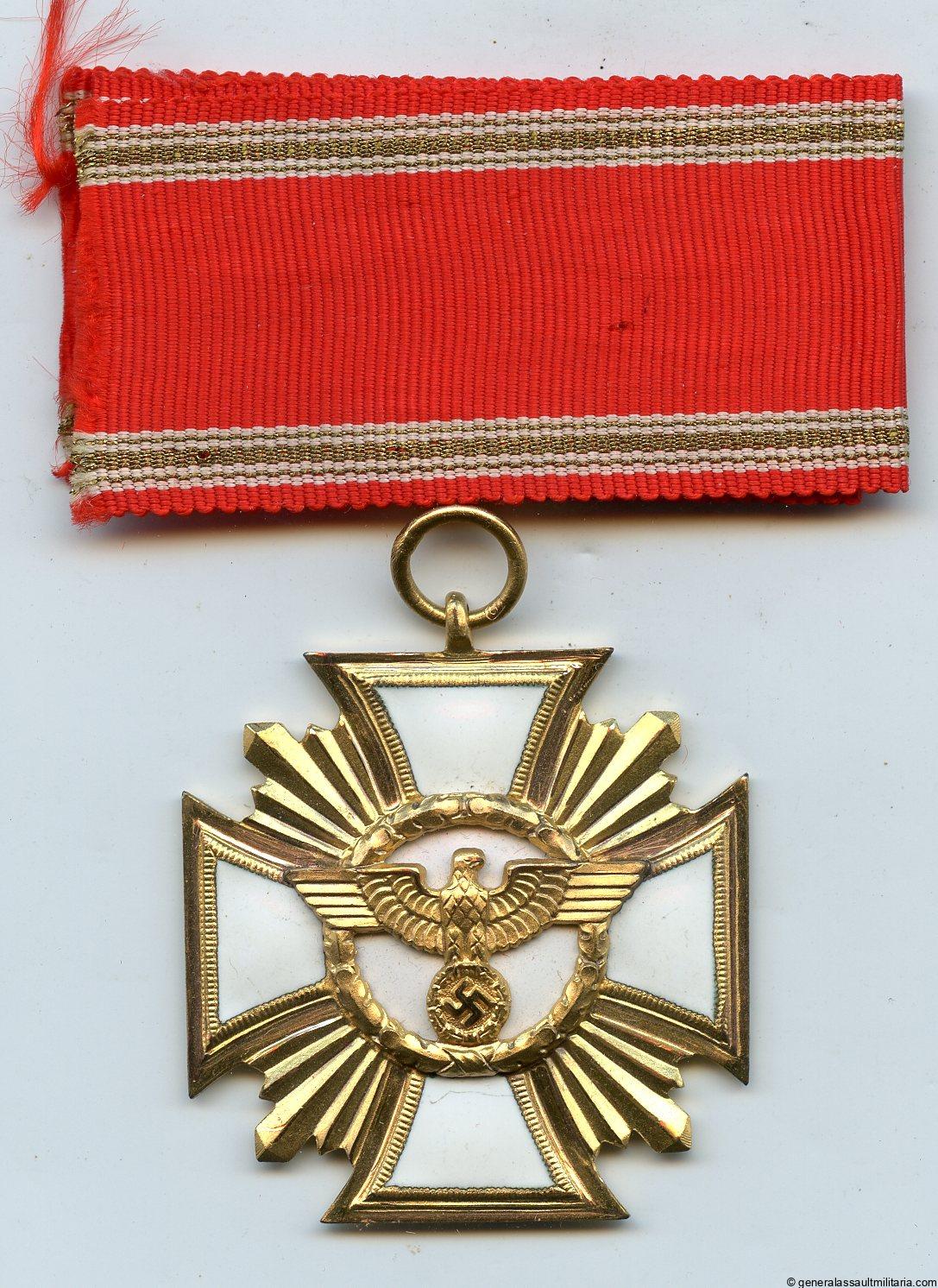 NSDAP loyal service medal 25 years – MM19 Wilhelm Deumer, Lüdenscheid. Tombac construction with white enamel inlay and gilded surface. Maker marked with the RZM M11/19 makers mark for Wilhelm Deumer. Remains in near mint condition with perfect gilding on the the tombac parts and nearly flawless enamel. Shows a thin scratch or hairline crack on the lower arm, barely visible. Exceptional very high quality example that comes with a free post war case an extra.
