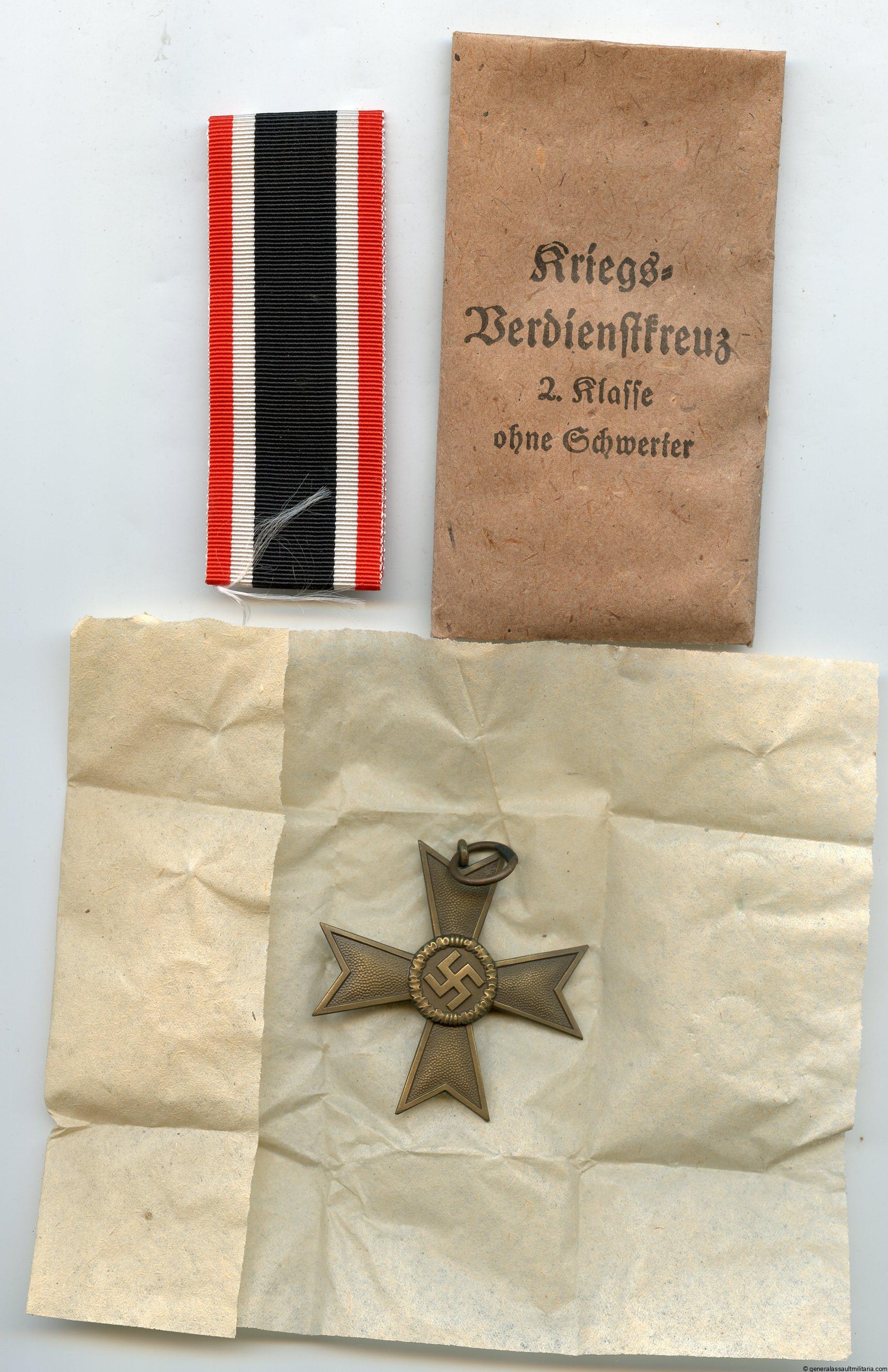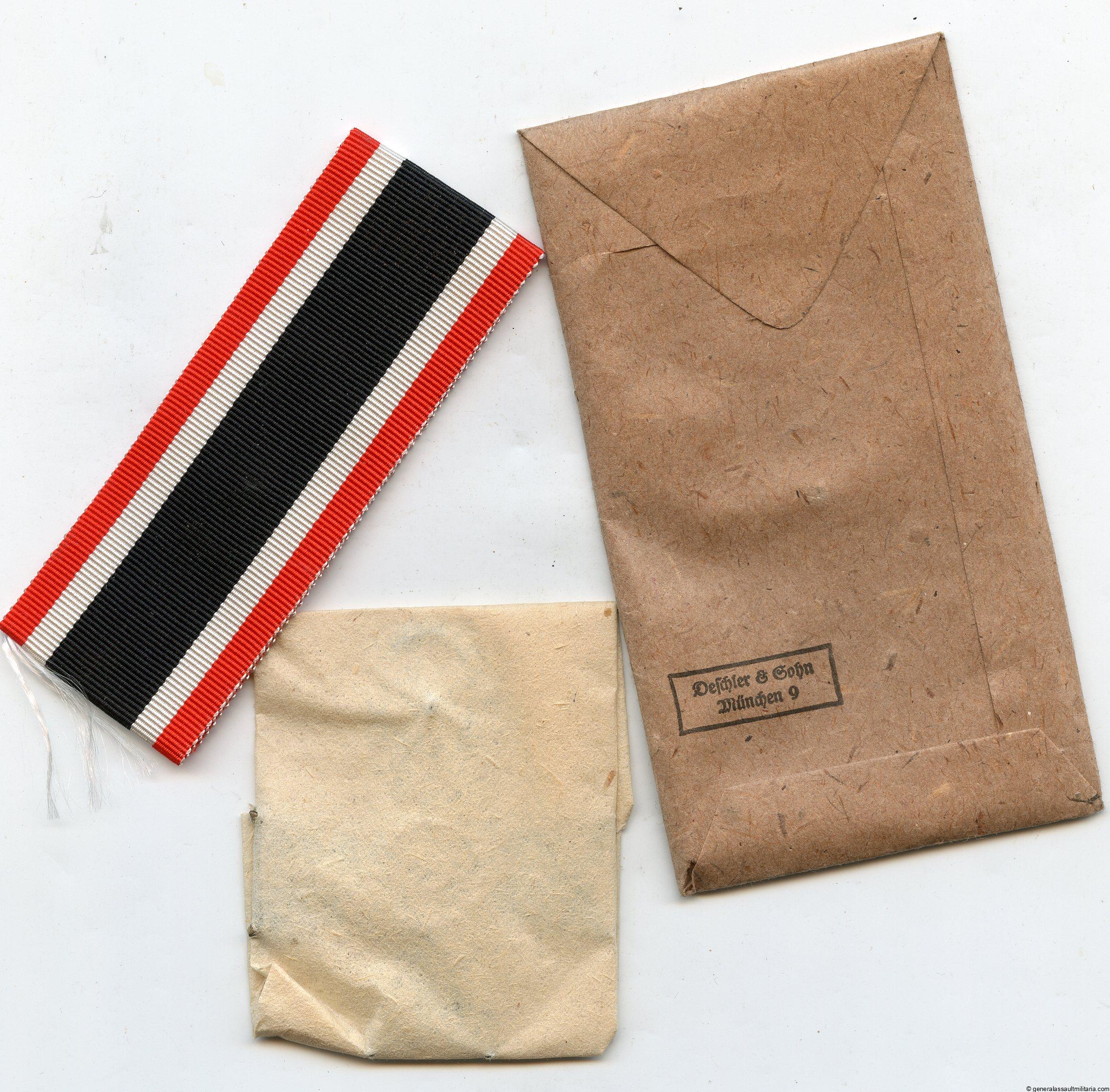 War merit cross without swords 2nd class + packet – Deschler & Sohn, München. Early war tombac medal with maker 1 stamp for Deschler in the ring. Comes with matching packet, packing paper and ribbon. Perfect mint condition and untouched from the Deschler hoard.
