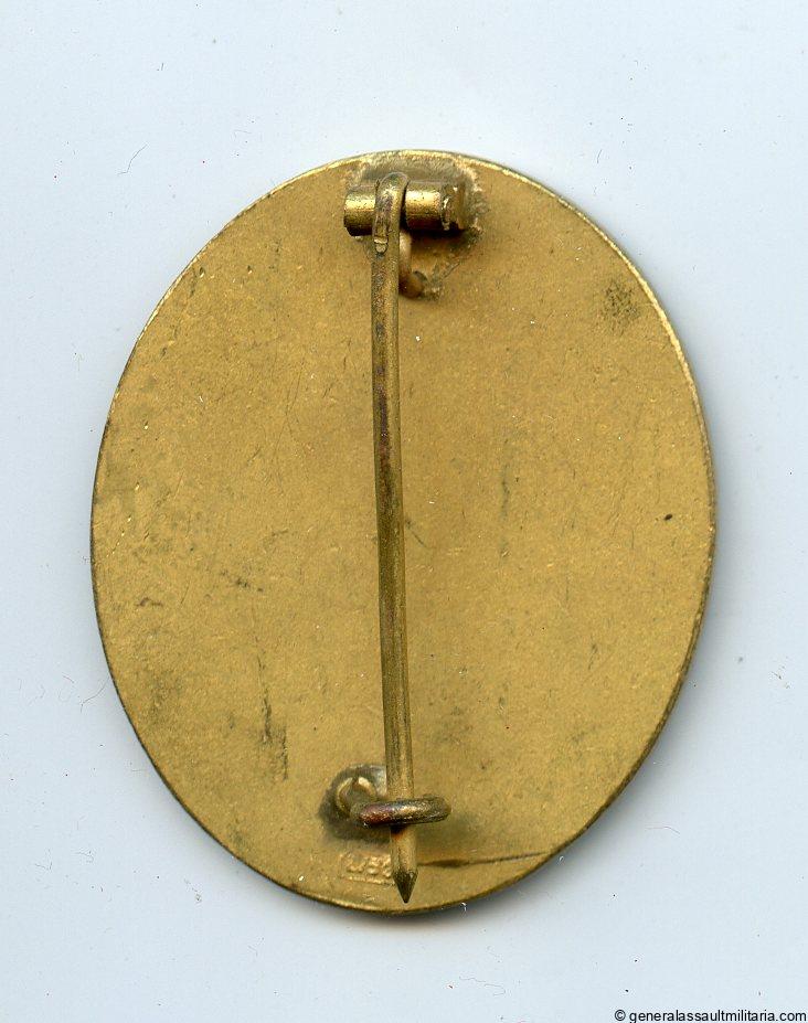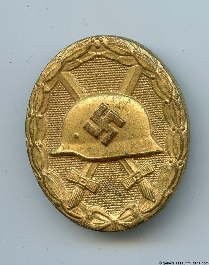 Wound badge in gold – L/53 Hymmen & Co, Lüdenscheid. Mid war solid tombac ‘Verwundetenabzeichen’ with L/53 stamp under the catch. Typical H&CL production with thick gold finish and directly soldered catch. Remains in lightly worn to unworn condition and retains nearly 100% of the finish. Very uncommon LDO marked example especially in this condition.