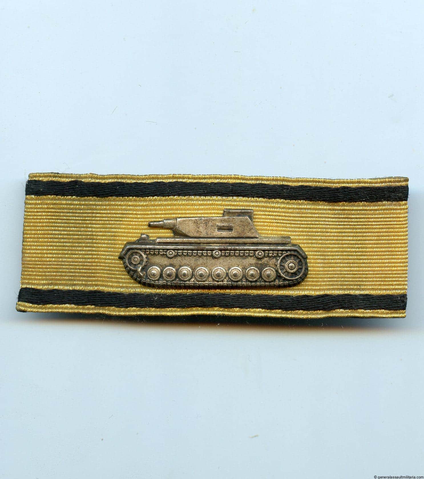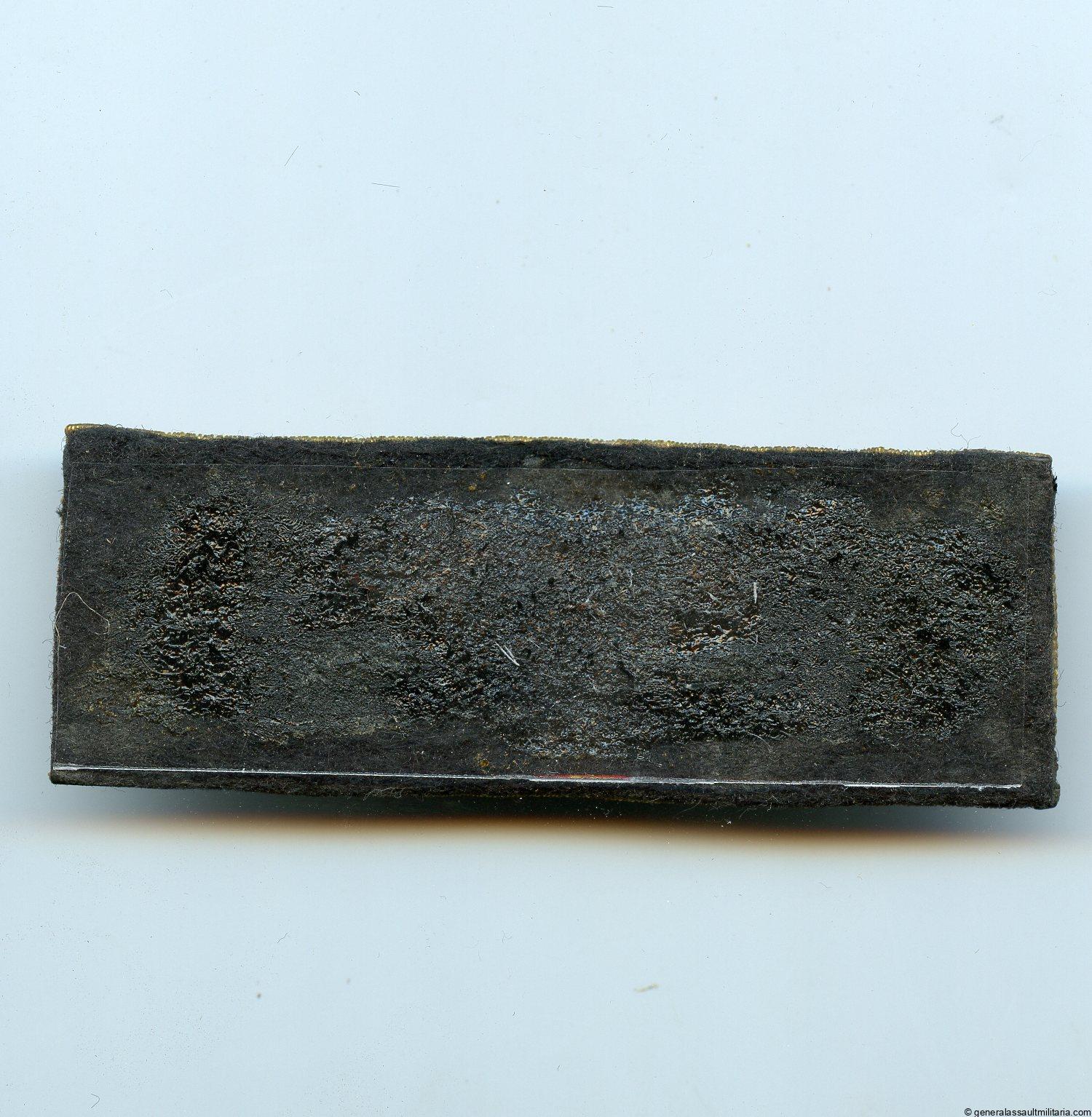 Tank destruction badge in gold – Type 3. Hollow steel panzer with type 3 design, factory flaw and silver finish. Steel back plate with all three prongs intact and the back cloth present. Remains in unworn condition with a light patina to the panzer and perfect yellow/gold appearance. Has some type of sticky residue on the reverse that was used to display it. Could be removed partially, but it is a long and slow process. Nonetheless a complete and very rare ‘Panzervernichter’ in gold.
