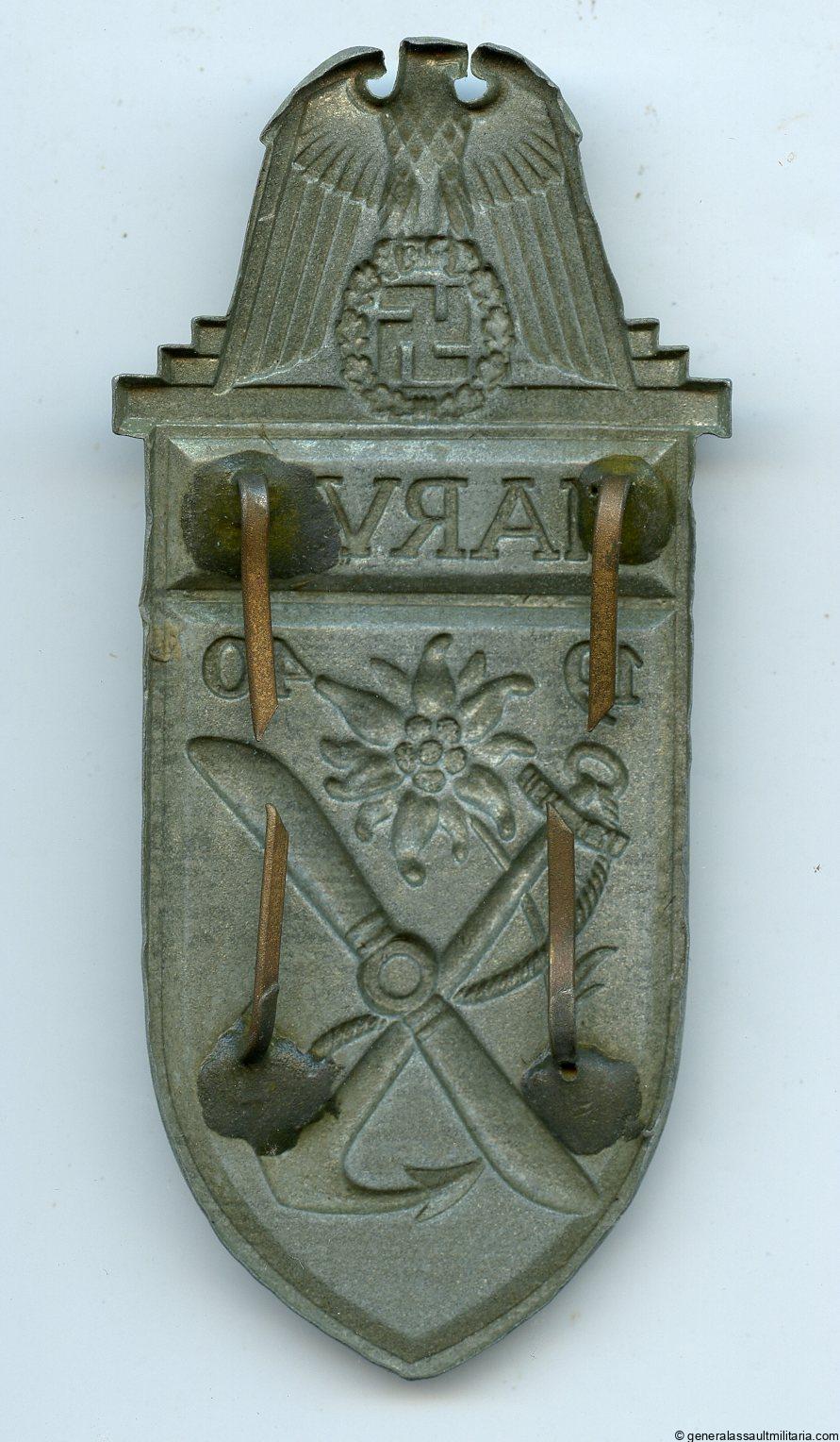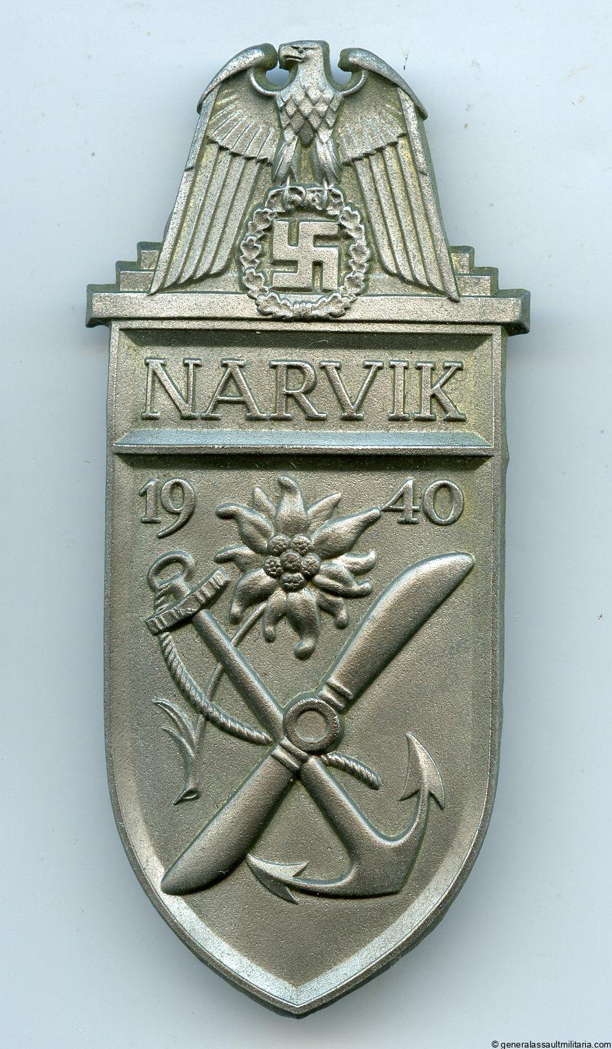 Luftwaffe/Heer Narvik shield – unknown maker. Zinc construction shield with silver finish and soldered on prongs. Remains in perfect mint condition with all finish present and all 4 prongs untouched. These could be bought without cloth and and backplate, without cloth or with plate, cloth and fully covered. Nearly impossible to upgrade.