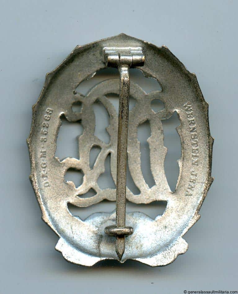 DRL sports badge in silver – Hermann Wernstein, Jena. Early tombac DRL sports badge with silver plated finish and frosting. Remains in excellent near mint condition with no wear and all finish remaining, only showing the slightest of patina.