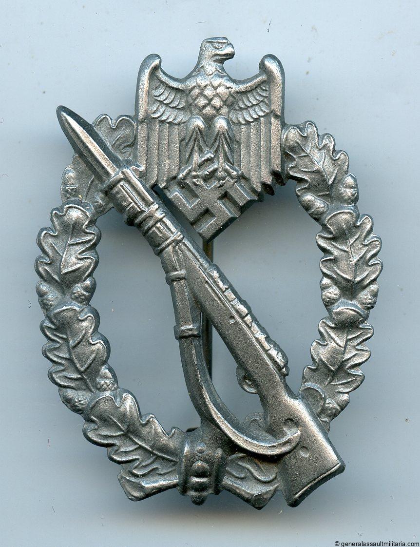 Infantry assault badge in silver – E.F. Wiedmann, Frankfurt. Late war solid zinc Wiedmann design and maker marked IAB with variant setup. Remains in perfect unworn condition with a zinc silvery look. Came directly from a small LDO shop hoard find.