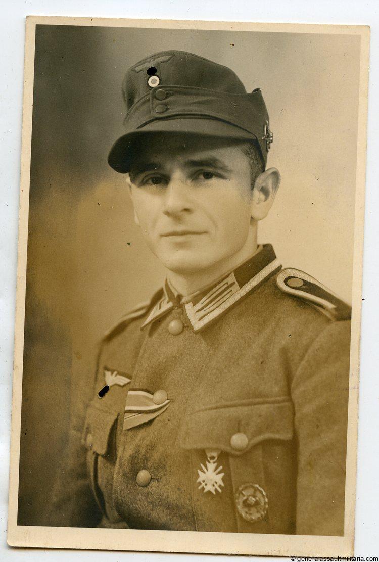 postcard size portrait with Bulgaria military order for bravery in wear. Slight light damage to the front, but with very uncommon bulgaria medal hanging from the left breast pocket. Has both eagles on the cap denazified.