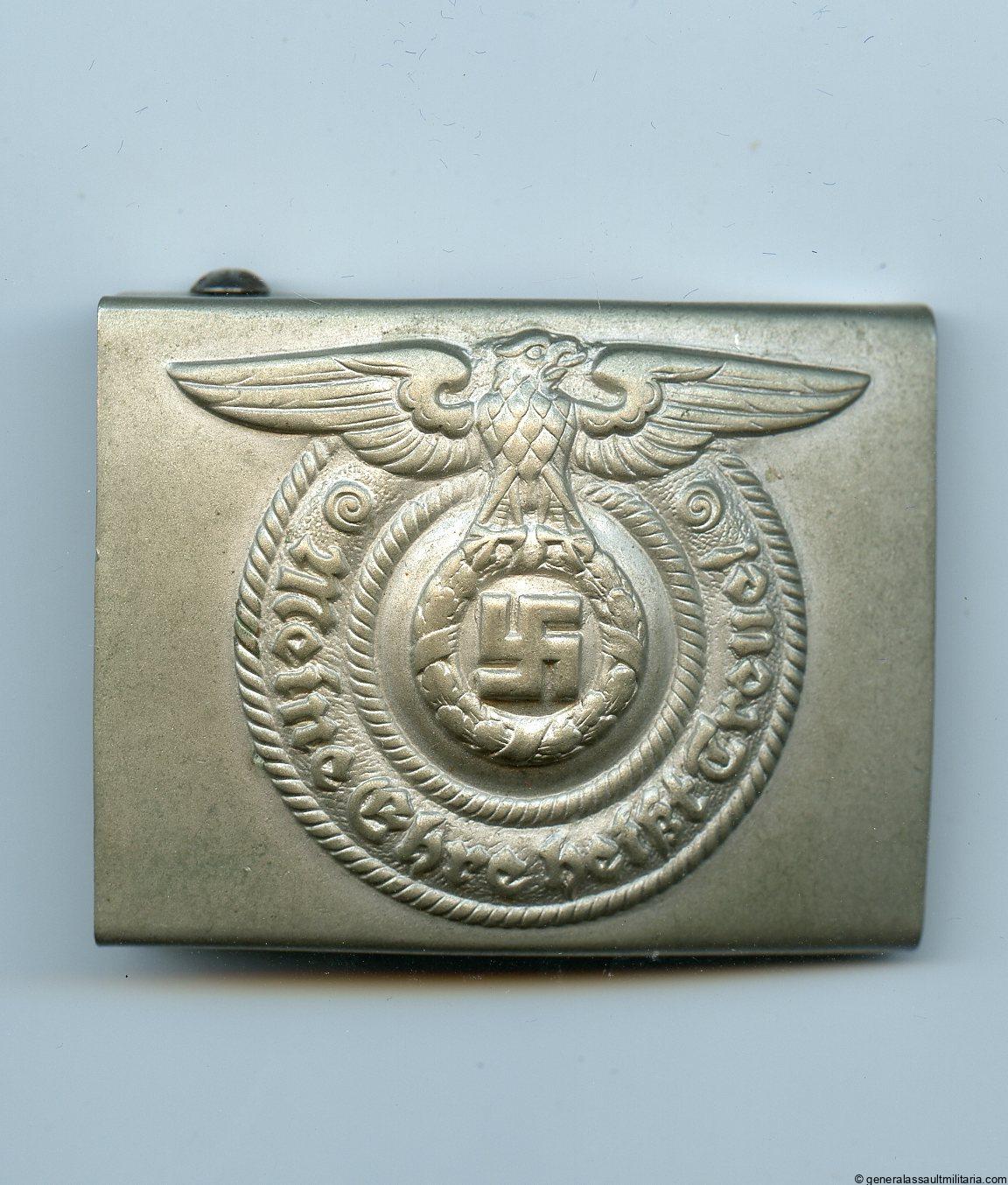 Allgemeine SS/VT buckle – Overhoff & Cie, Lüdenscheid. Pre war nickel silver construction buckle with O&C Ges Gesch maker mark. Remains in mint unworn condition with perfect finish on the backing and nearly all the frosting remaining on the front. Very difficult buckle to find in this pristine condition.