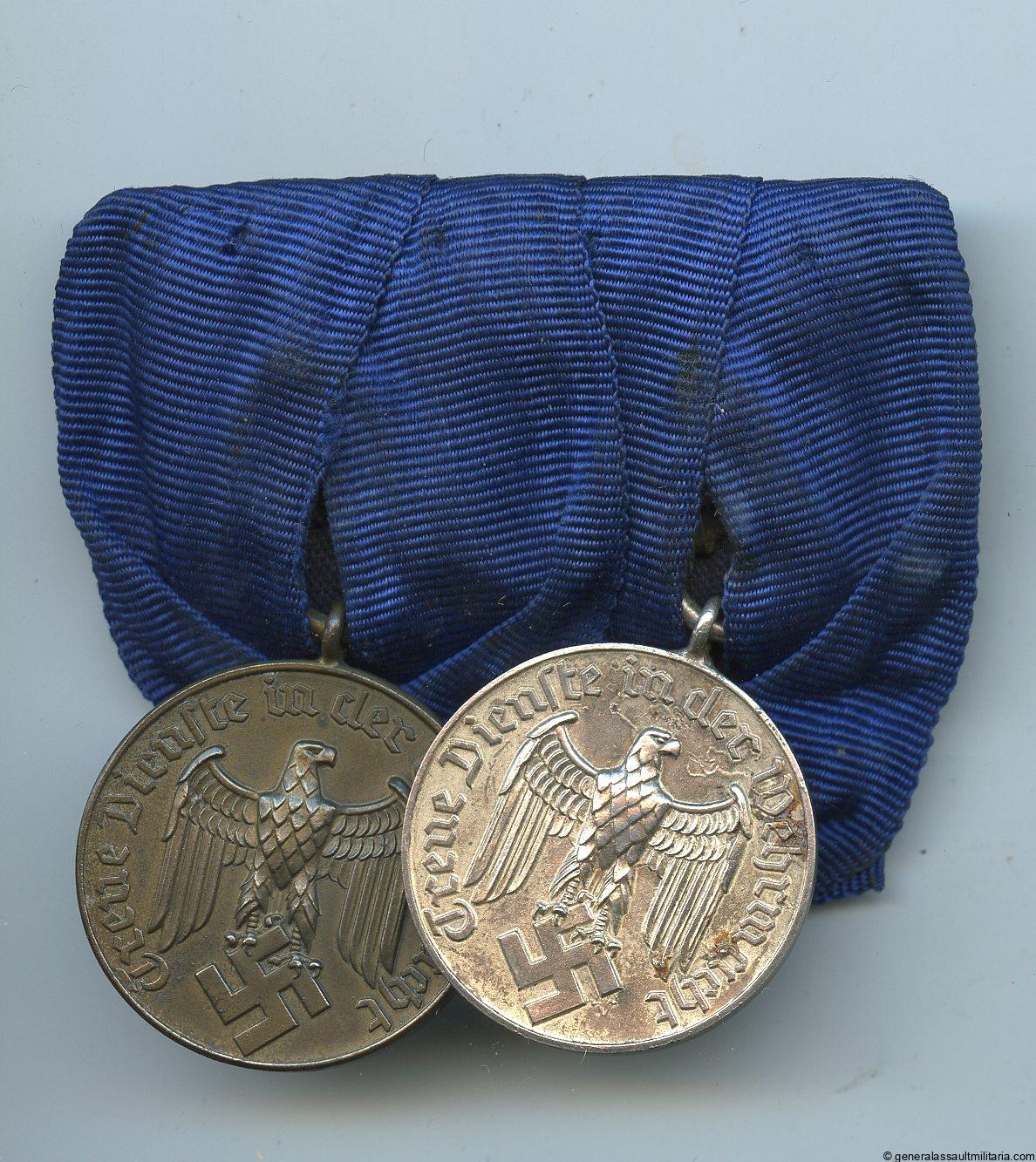 12y + 4y loyal service medal bar. Nicely mounted 4 + 12 year medals either for Luftwaffe or Heer, with both the attachment eagles missing. Remains in lightly worn condition with both the steel construction medals fairly well preserved. The bar is made up with green back cloth and shows some age to the ribbons.