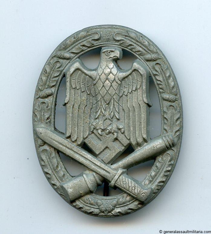 General assault badge – ”4 rivet” maker. Semi hollow zinc badge with riveted setup. Remains in worn condition with the finish fully lost. This maker was the only maker to use this unique style of attaching the setup. Slightly more uncommon GAB that still does not have a maker linked to it. No damage or repairs.