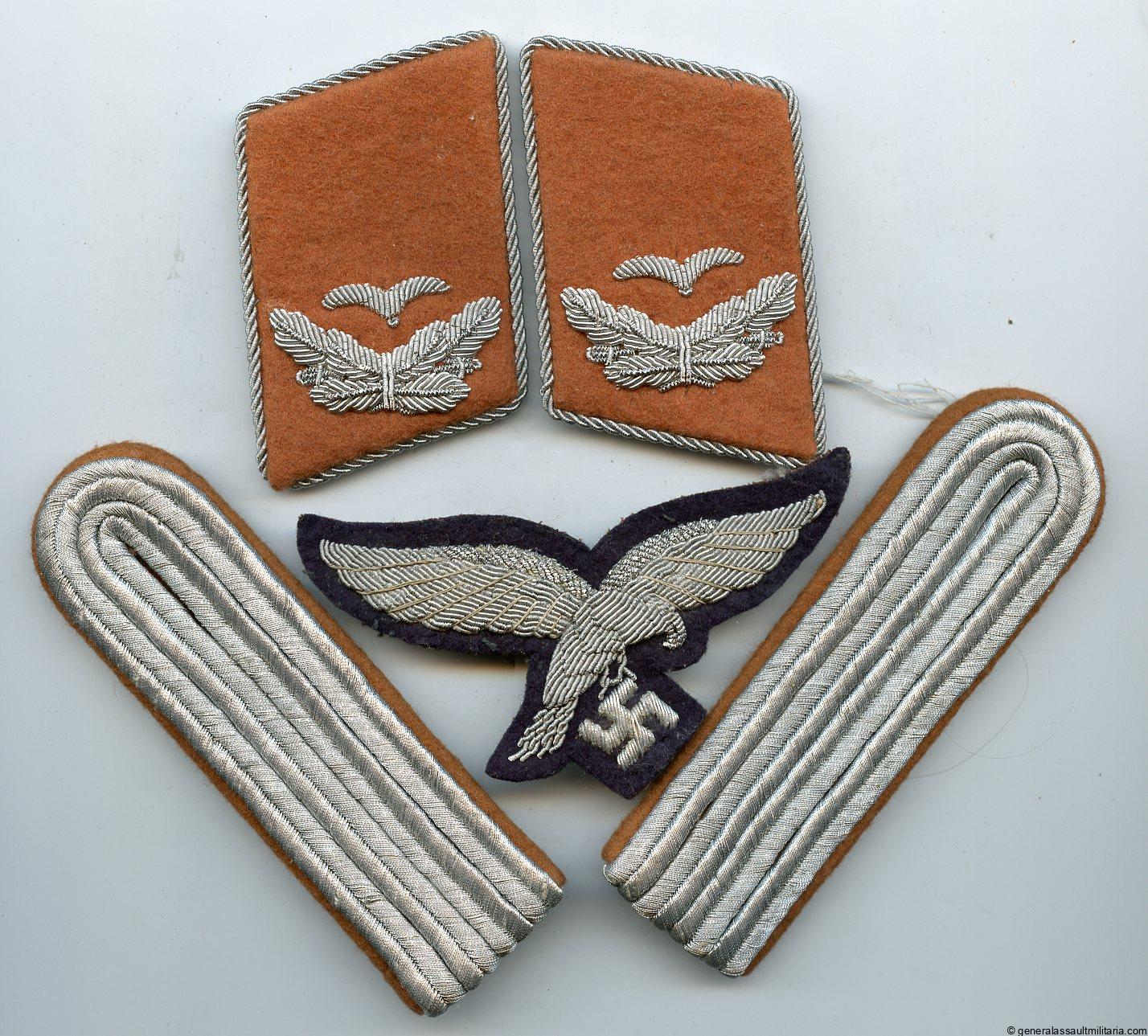 Luftwaffe Nachrichten(Signals) Leutnant insignia set. Matching set with both the collar tabs, bullion breast eagle and shoulder boards. Remains in excellent condition with minimal wear. Top set!