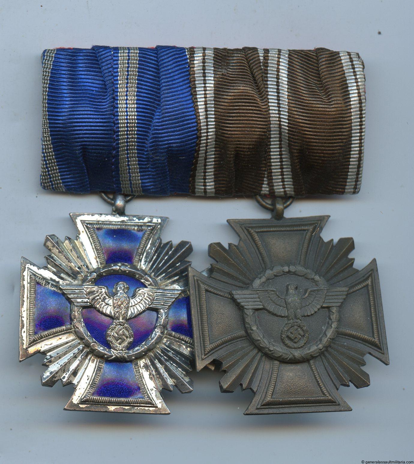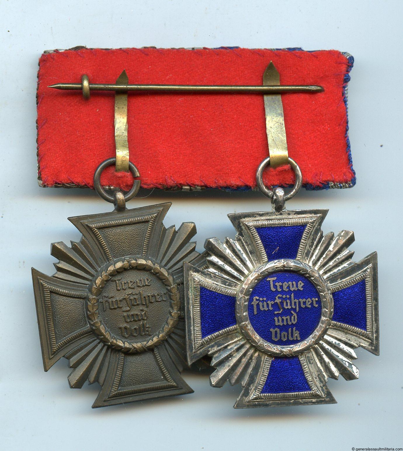 Two piece medal bar with 10 + 15 year NSDAP medal. Zinc 10 year NSDAP medal and tombac silver plated 15 year with blue enamel inlay. Remains in very good condition with most of the bronze finish still present on the 10 year and some patina on the silver plating of the 15 year. No chips or damage. Uncommon bar 2 of the 3 NSDAP service medals.