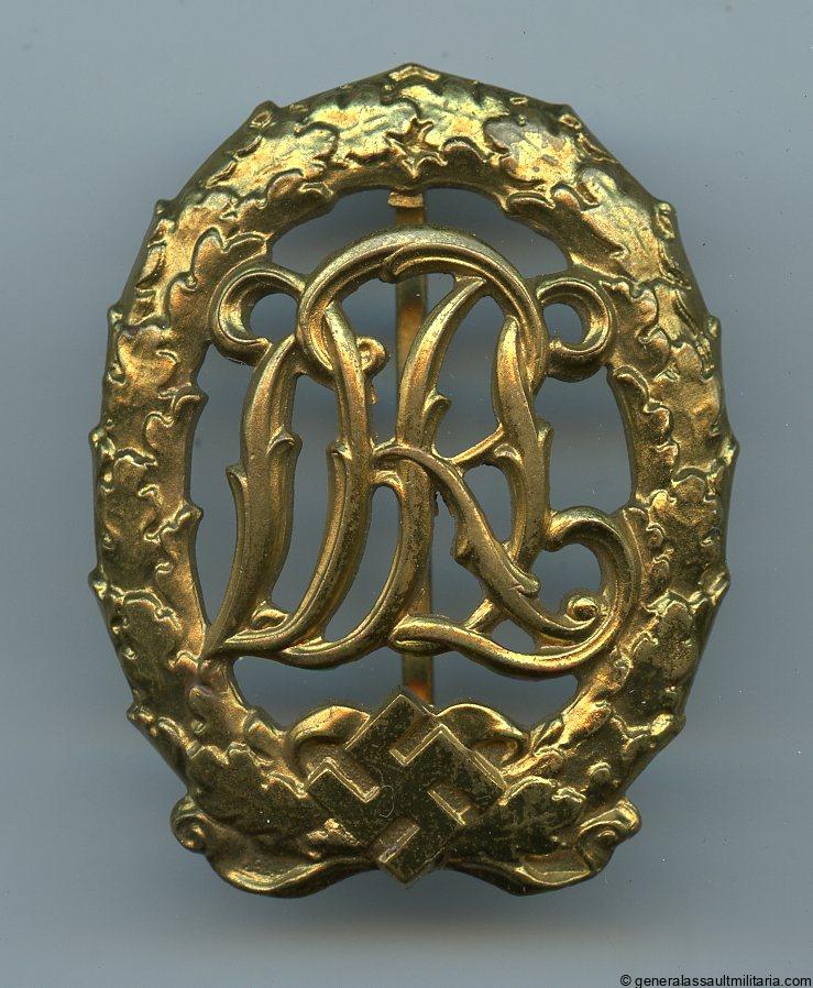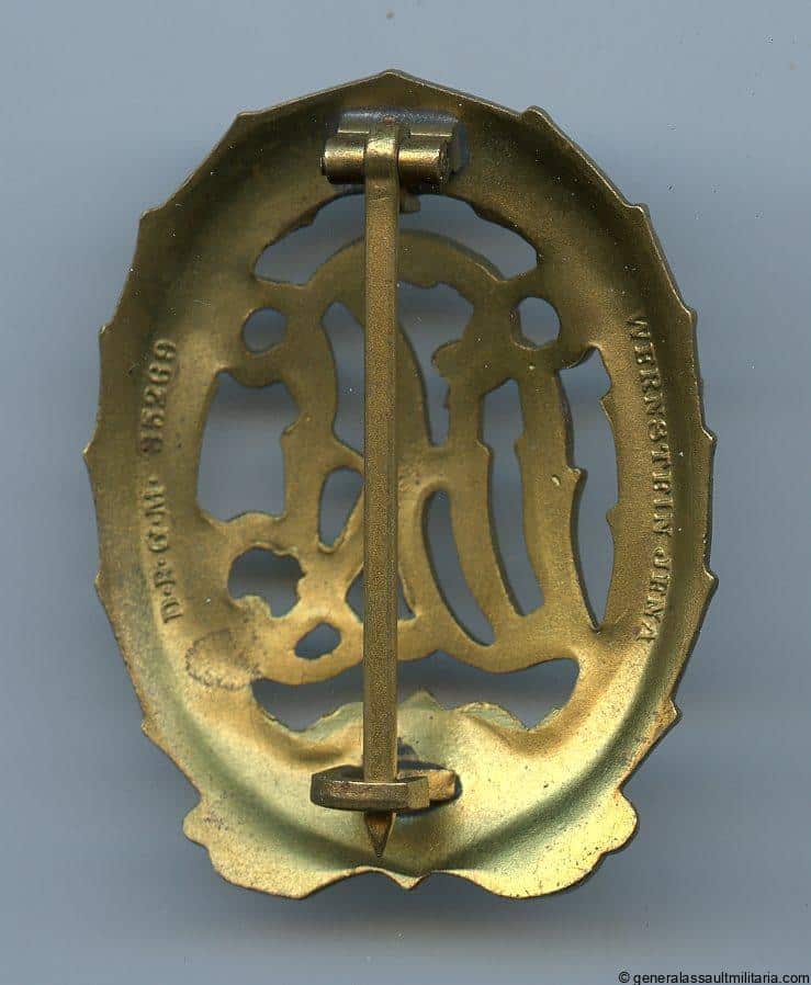 DRL sports badge in gold – Hermann Wernstein, Jena. Early pre war tombac DRL badge with Wernstein makers mark and their typical catch. Remains in near mint condition with no wear and still full bright gilding present. Excellent gold grade DRL badge.