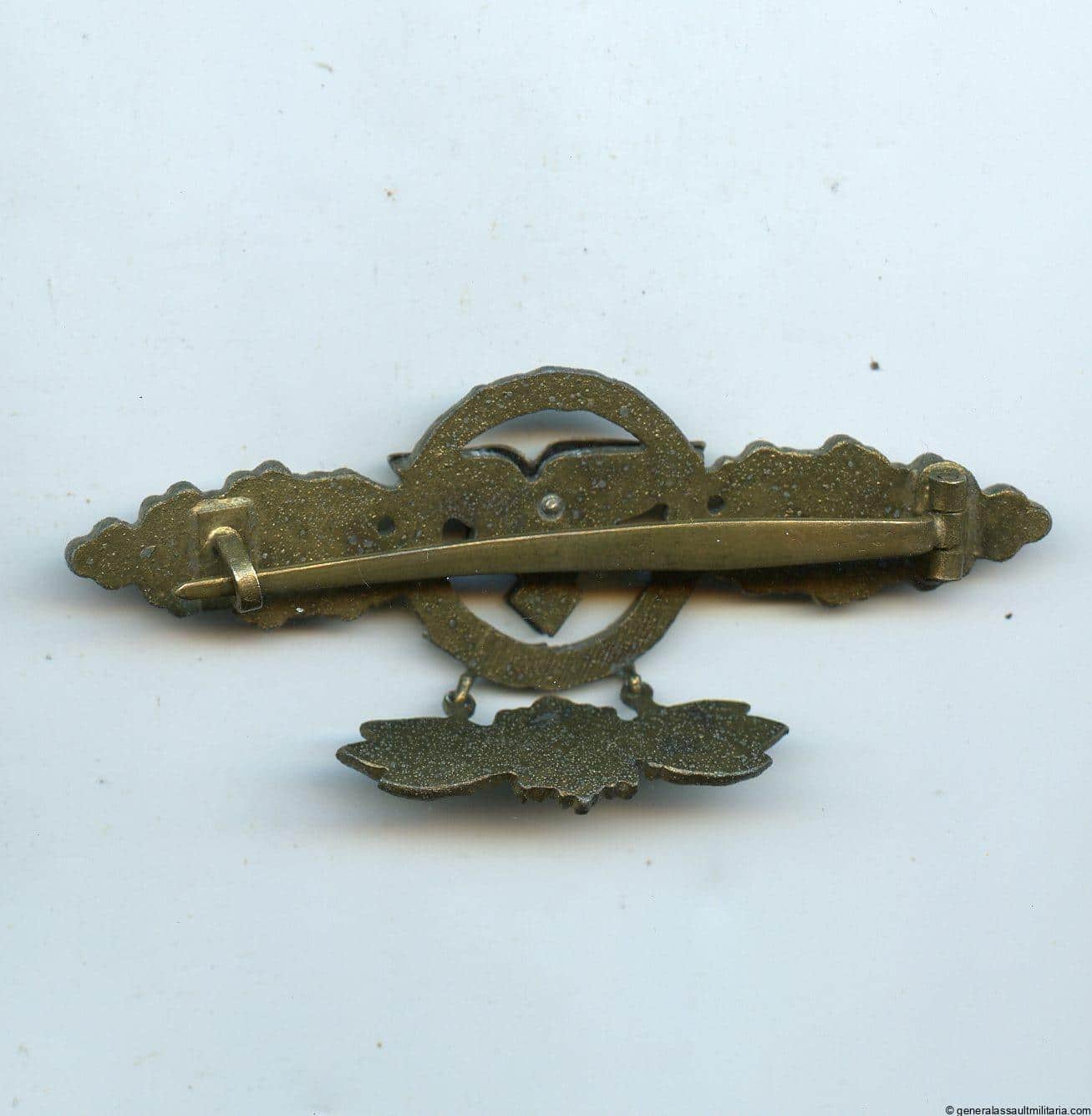 Luftwaffe transport clasp pin gold with hanger – Friedrich Linden, Lüdenscheid. Mid to late war zinc clasp with gold finish and factory attached pendant. Remains in unworn too very lightly worn condition with near perfect gold finish remaining and no discoloration. Has the integral hanger still perfectly attached and in equally well preserved finish. Very uncommon clasp!