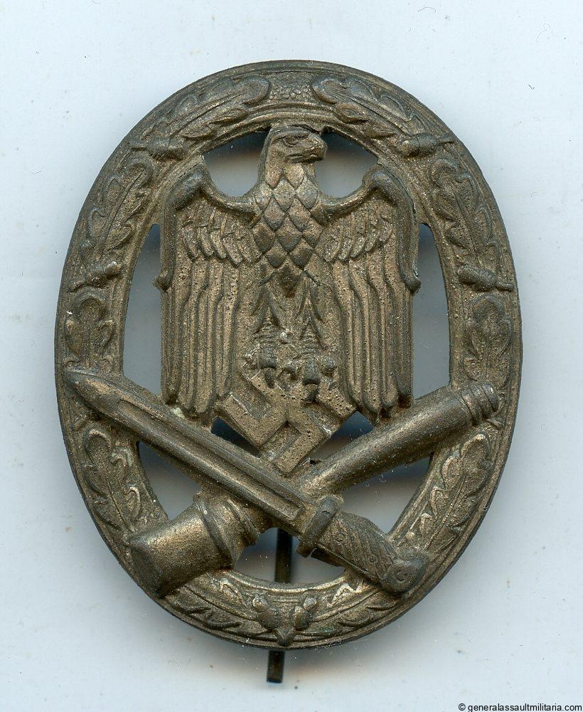 General assault badge – C.E.Juncker, Berlin. Early to mid war hollow zinc Juncker design badge. Remains in lightly worn condition with patinated finish, but still most of it intact. Uncommon badge with great details and design.