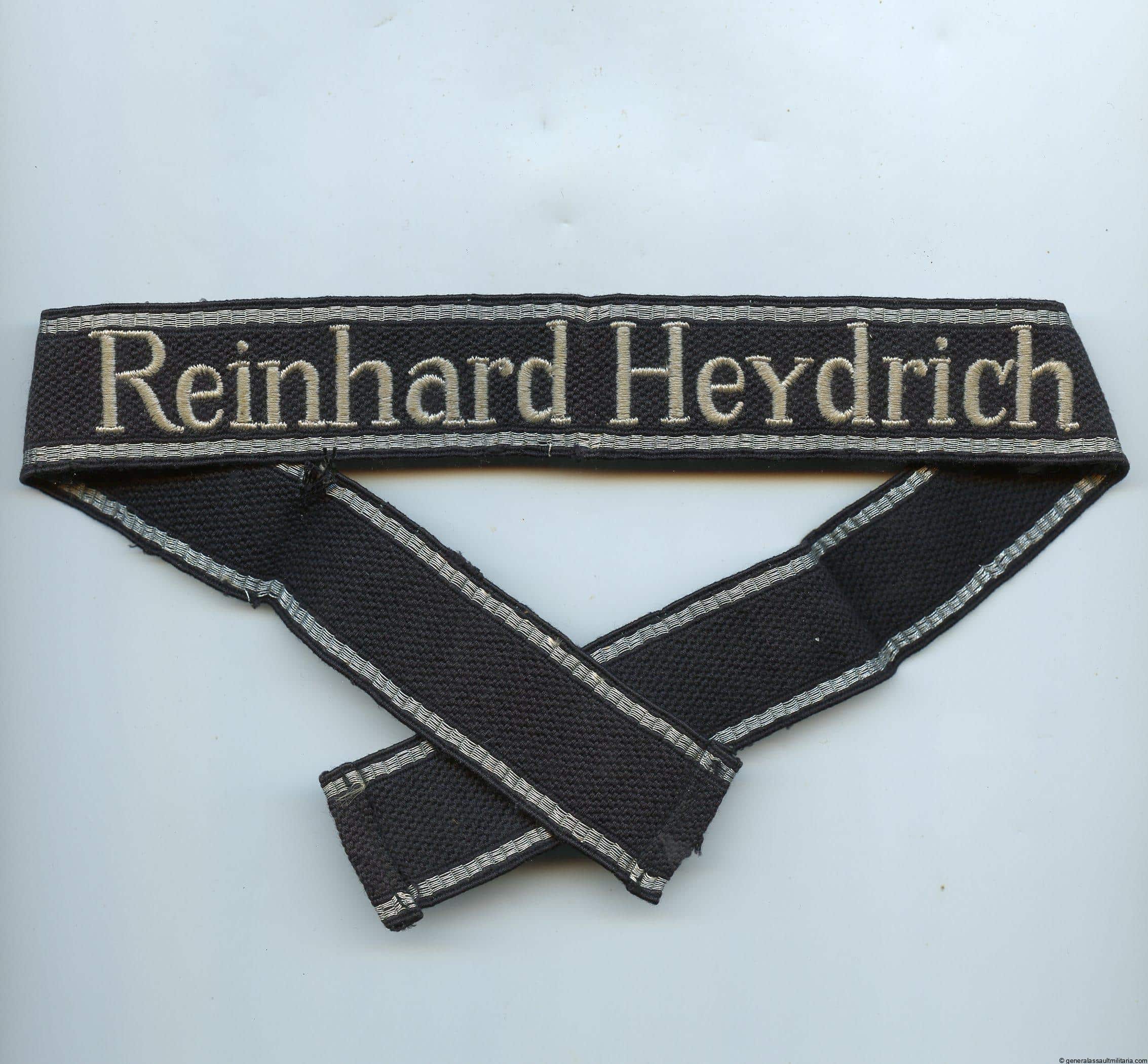 Waffen-SS cuff title – Reinhard Heydrich. RZM type cufftitle with 7 silver wire border and woven lettering. Remains in uniform removed condition but retains its full length. Honorary cuff title that was worn by members of the SS Gebirgsjäger Regiment 11 “Reinhard Heydrich”. Excellent cuff title with minimal wear!